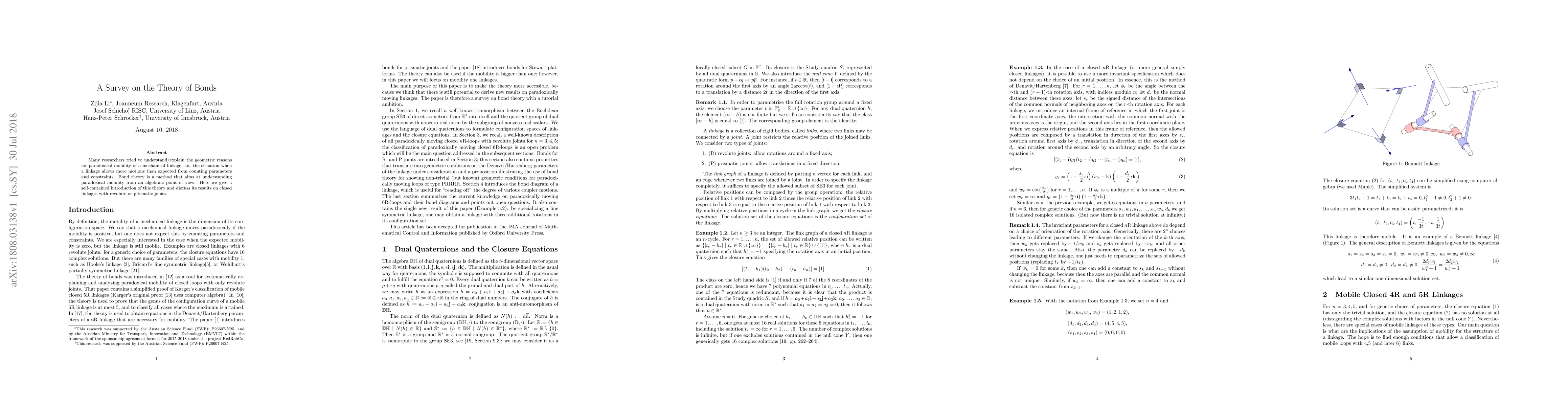 This paper provides a comprehensive introduction to bond theory, an algebraic method for understanding the paradoxical mobility of mechanical linkages, and discusses its applications to closed linkages with revolute or prismatic joints.
