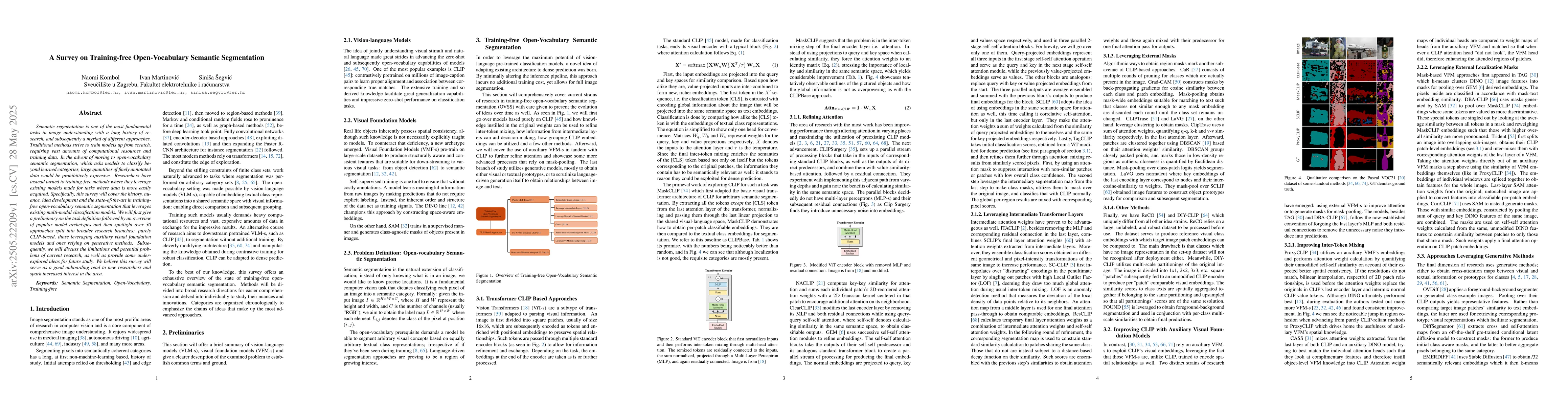 The paper provides a comprehensive survey of training-free open-vocabulary semantic segmentation methods, covering task definition, model archetypes, and over 30 approaches categorized into three research branches.