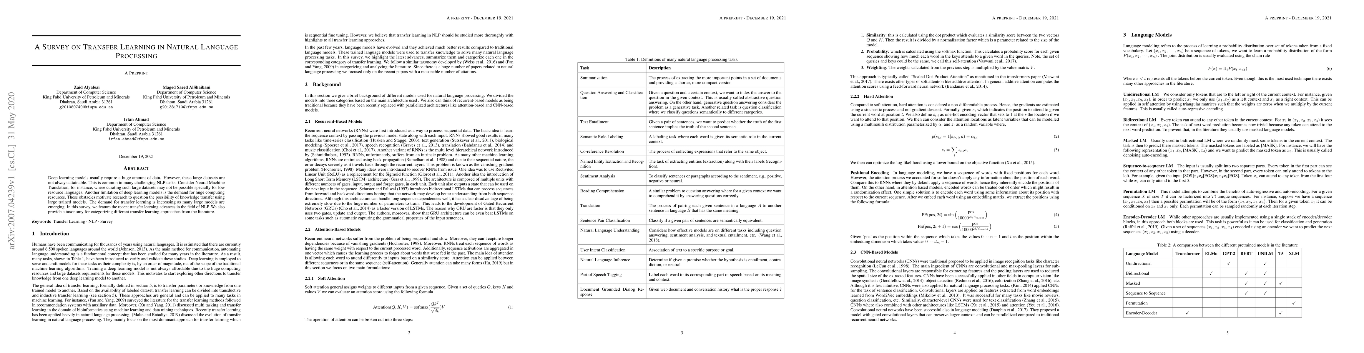 This paper surveys recent advances in transfer learning for natural language processing (NLP), addressing the challenge of limited data and computational resources. It categorizes various transfer learning methods and highlights their applications in tasks like Neural Machine Translation.