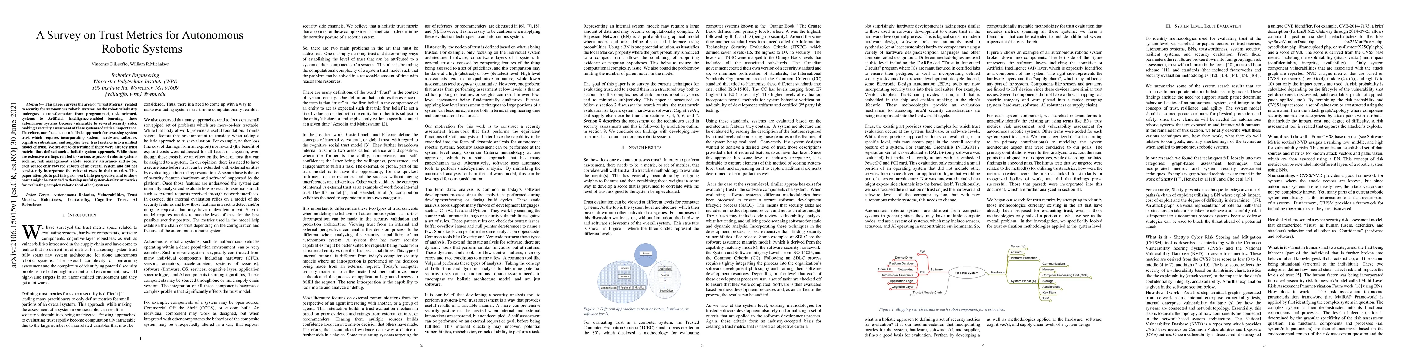 This paper surveys the area of Trust Metrics related to security for autonomous robotic systems. As the robotics industry undergoes a transformation from programmed, task oriented, systems to Artificial Intelligence-enabled learning, these autonomous systems become vulnerable to several security risks, making a security assessment of these systems of critical importance. Therefore, our focus is on a holistic approach for assessing system trust which requires incorporating system, hardware, software, cognitive robustness, and supplier level trust metrics into a unified model of trust. We set out to determine if there were already trust metrics that defined such a holistic system approach. While there are extensive writings related to various aspects of robotic systems such as, risk management, safety, security assurance and so on, each source only covered subsets of an overall system and did not consistently incorporate the relevant costs in their metrics. This paper attempts to put this prior work into perspective, and to show how it might be extended to develop useful system-level trust metrics for evaluating complex robotic (and other) systems.
