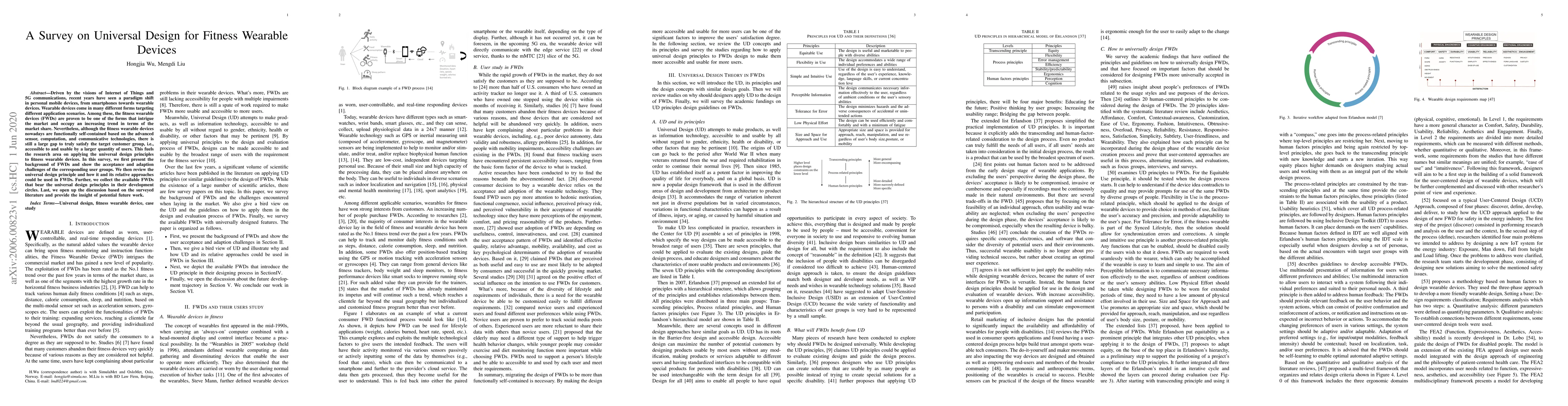 Driven by the visions of Internet of Things and 5G communications, recent years have seen a paradigm shift in personal mobile devices, from smartphones towards wearable devices. Wearable devices come in many different forms targeting different application scenarios. Among these, the fitness wearable devices (FWDs) are proven to be one of the forms that intrigue the market and occupy an increasing trend in terms of the market share. Nevertheless, although the fitness wearable devices nowadays are functionally self-contained based on the advanced sensor, computation, and communicative technologies, there is still a large gap to truly satisfy the target customer group, i.e., accessible to and usable by a larger quantity of users. This fuels the research area on applying the universal design principles to fitness wearable devices. In this survey, we first present the background of FWDs and show the acceptance and adaption challenges of the corresponding user groups. We then review the universal design principle and how it and its relative approaches could be used in FWDs. Further, we collect the available FWDs that bear the universal design principles in their development circles. Last, we open up the discussion based on the surveyed literature and provide the insight of potential future work.
