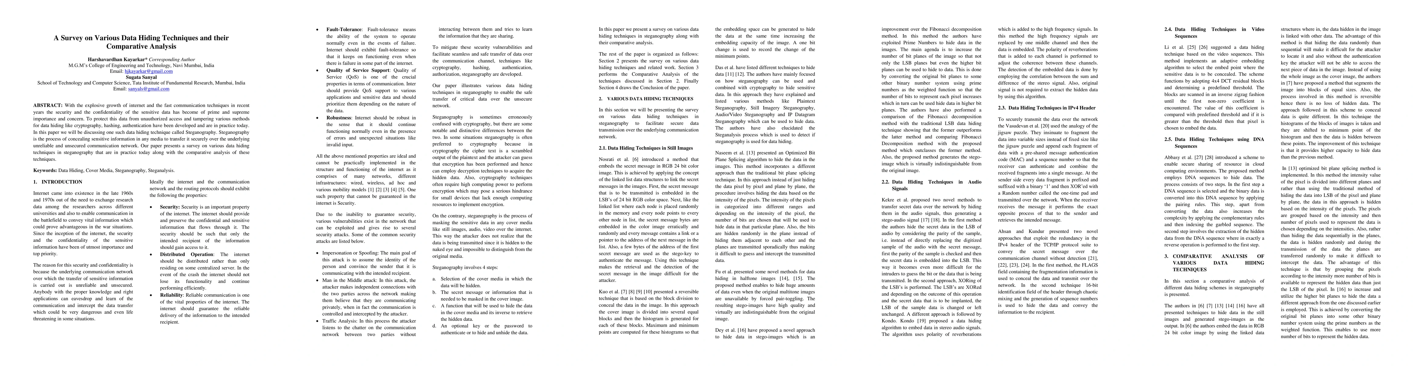 With the explosive growth of internet and the fast communication techniques in recent years the security and the confidentiality of the sensitive data has become of prime and supreme importance and concern. To protect this data from unauthorized access and tampering various methods for data hiding like cryptography, hashing, authentication have been developed and are in practice today. In this paper we will be discussing one such data hiding technique called Steganography. Steganography is the process of concealing sensitive information in any media to transfer it securely over the underlying unreliable and unsecured communication network. Our paper presents a survey on various data hiding techniques in Steganography that are in practice today along with the comparative analysis of these techniques.