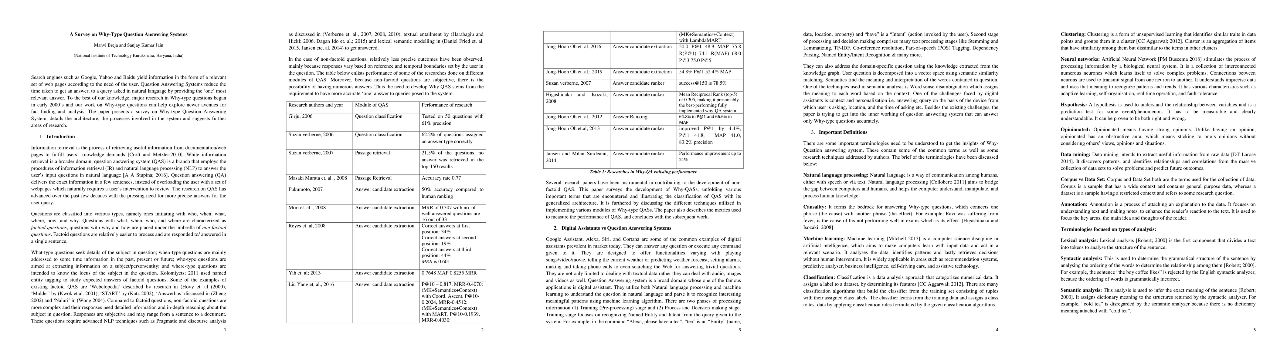 Search engines such as Google, Yahoo and Baidu yield information in the form of a relevant set of web pages according to the need of the user. Question Answering Systems reduce the time taken to get an answer, to a query asked in natural language by providing the one most relevant answer. To the best of our knowledge, major research in Why-type questions began in early 2000's and our work on Why-type questions can help explore newer avenues for fact-finding and analysis. The paper presents a survey on Why-type Question Answering System, details the architecture, the processes involved in the system and suggests further areas of research.