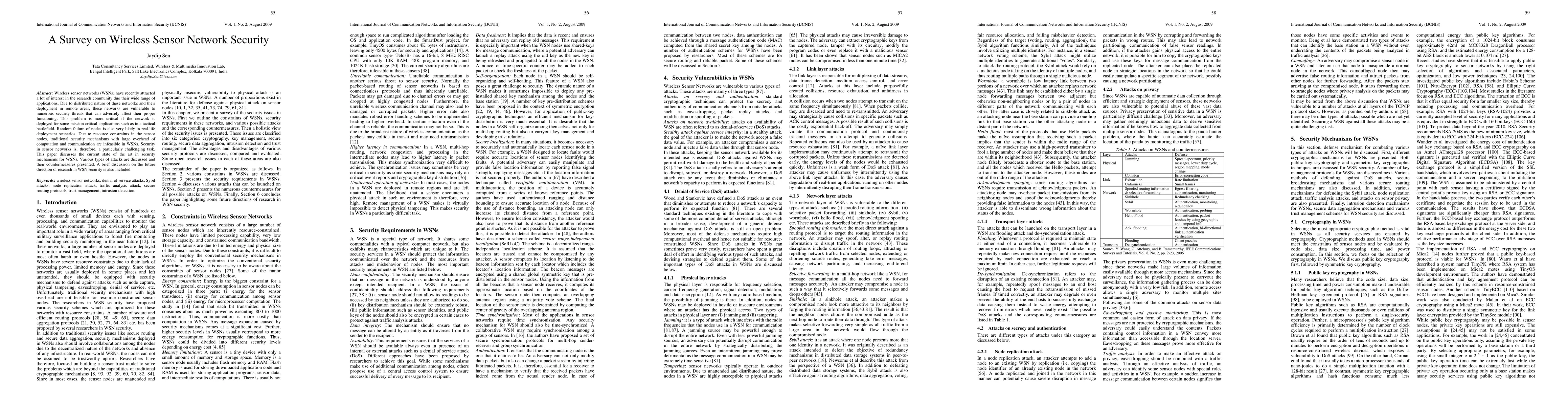 This paper surveys the current state of security mechanisms for wireless sensor networks (WSNs), highlighting the unique challenges posed by their resource constraints and vulnerability to attacks, and discusses potential future research directions. It covers various types of attacks and their countermeasures.