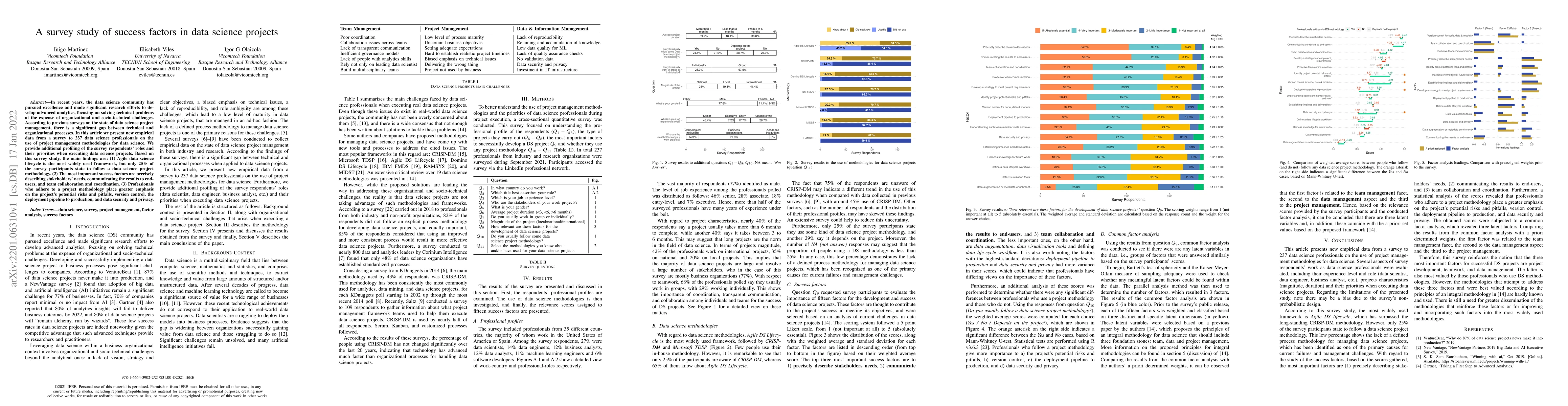 This survey study of 237 data science professionals reveals that while Agile is the most used framework, only 25% follow a data science project methodology. Key success factors identified include stakeholder needs clarity, effective communication, and team collaboration.