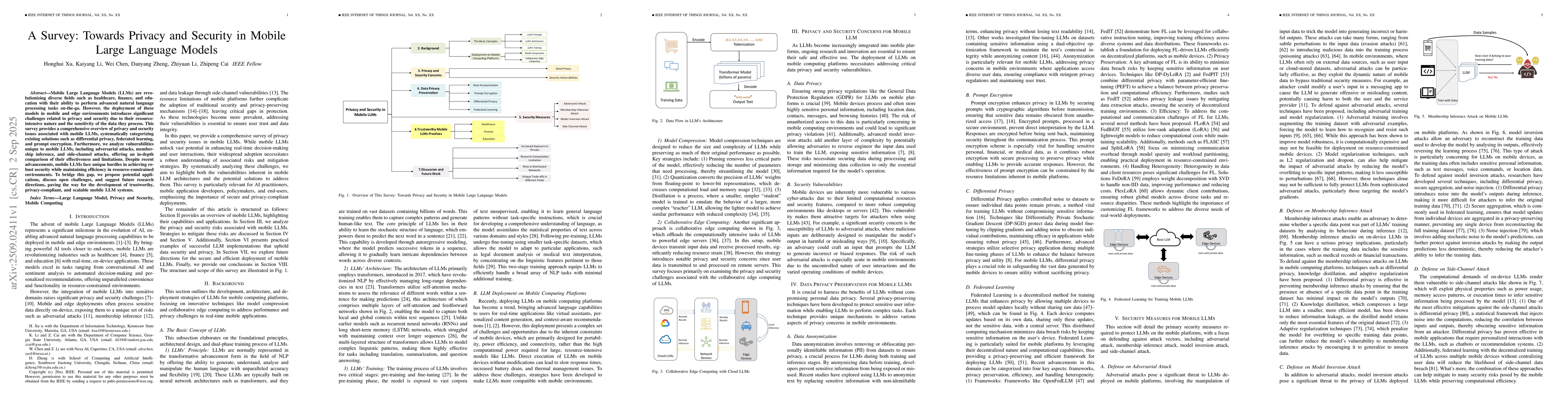 Mobile Large Language Models (LLMs) are revolutionizing diverse fields such as healthcare, finance, and education with their ability to perform advanced natural language processing tasks on-the-go. However, the deployment of these models in mobile and edge environments introduces significant challenges related to privacy and security due to their resource-intensive nature and the sensitivity of the data they process. This survey provides a comprehensive overview of privacy and security issues associated with mobile LLMs, systematically categorizing existing solutions such as differential privacy, federated learning, and prompt encryption. Furthermore, we analyze vulnerabilities unique to mobile LLMs, including adversarial attacks, membership inference, and side-channel attacks, offering an in-depth comparison of their effectiveness and limitations. Despite recent advancements, mobile LLMs face unique hurdles in achieving robust security while maintaining efficiency in resource-constrained environments. To bridge this gap, we propose potential applications, discuss open challenges, and suggest future research directions, paving the way for the development of trustworthy, privacy-compliant, and scalable mobile LLM systems.