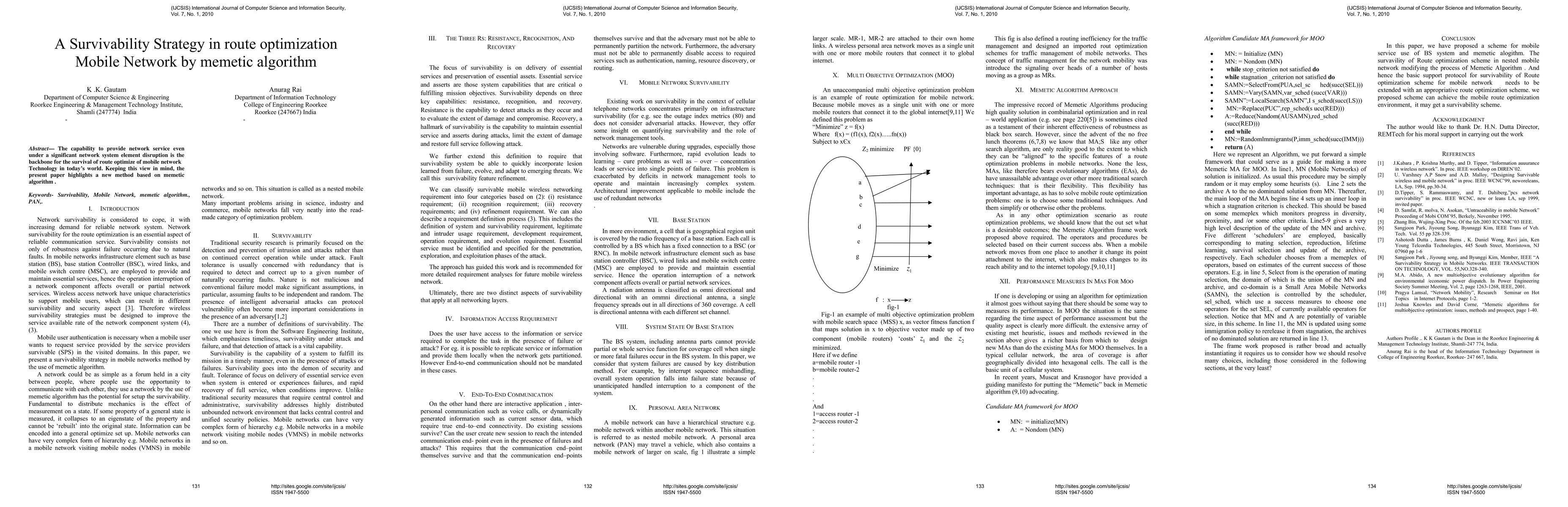 Summary: This paper proposes a survivability strategy for route optimization in mobile networks using a memetic algorithm to ensure network service continuity even under significant disruptions. The memetic algorithm aims to enhance the robustness and reliability of mobile network route optimization.