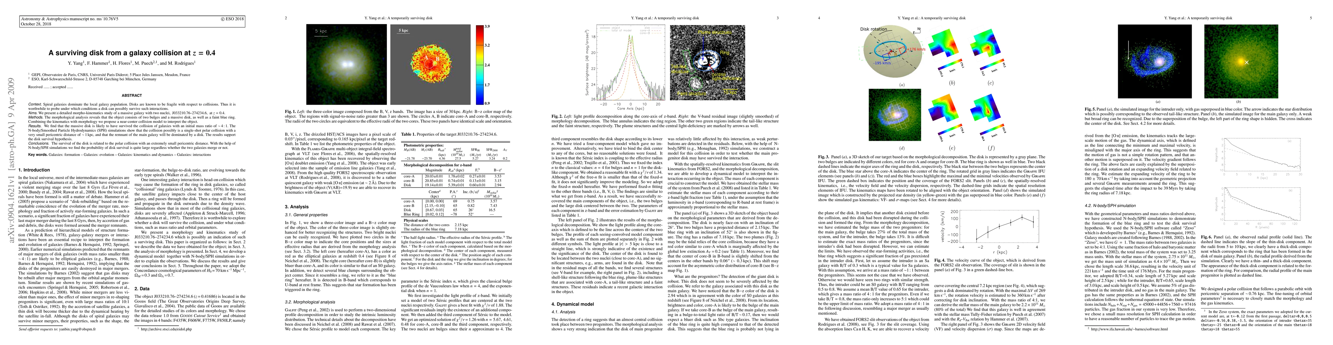 Researchers studied a galaxy collision at z=0.4, finding that a massive disk survived with an initial mass ratio of ~4:1. Simulations suggest a polar collision with small pericentric distance led to the disk's survival.