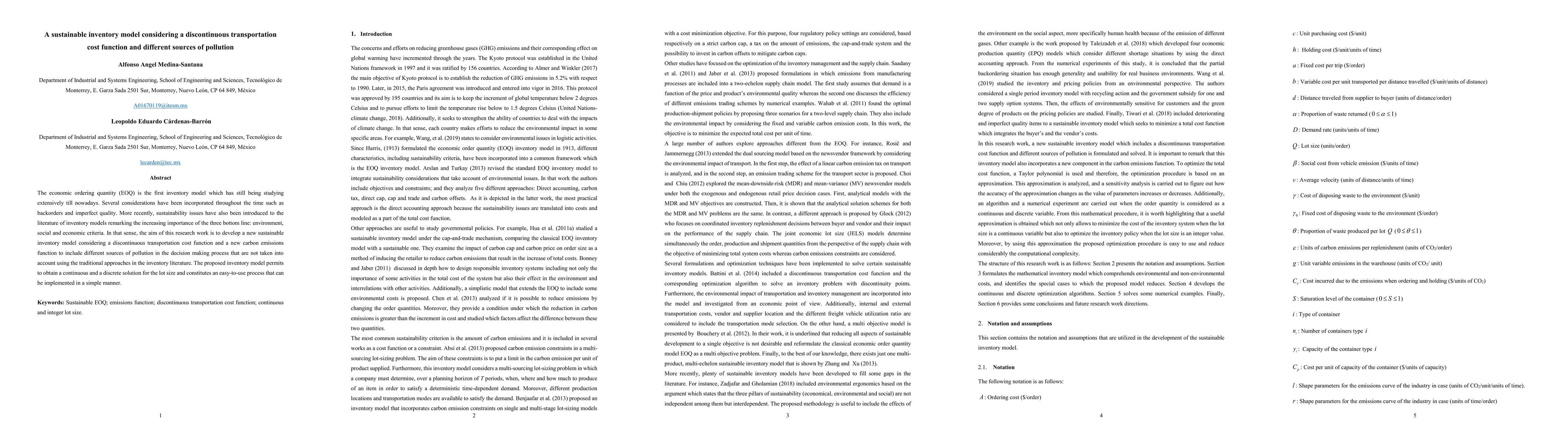 This paper develops a sustainable inventory model incorporating a discontinuous transportation cost function and a new carbon emissions function to account for various pollution sources. The model provides both continuous and discrete solutions for lot size, facilitating easy implementation in inventory management.