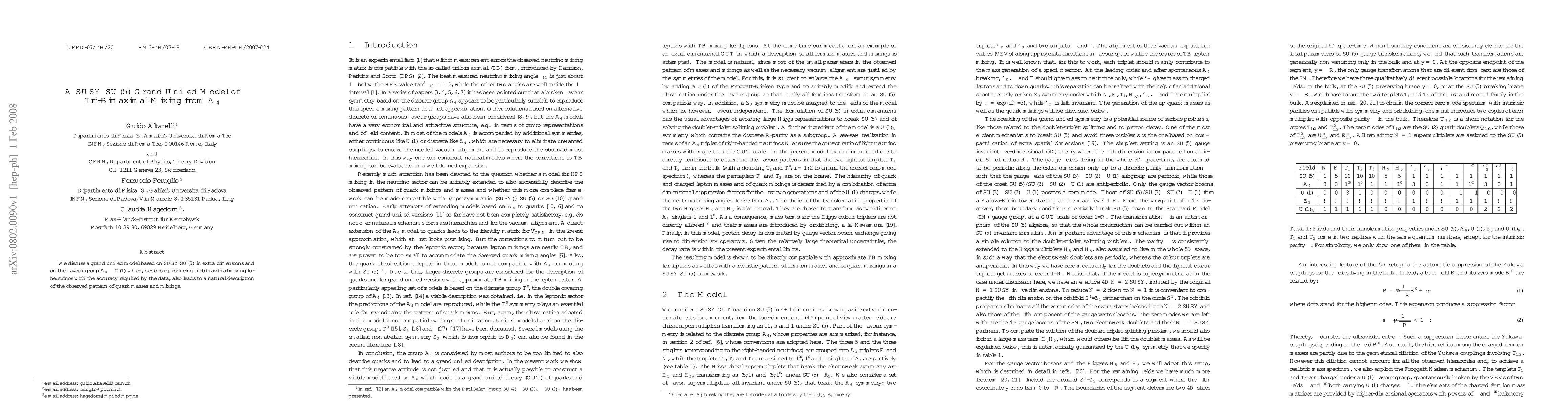 This paper proposes a SUSY SU(5) grand unified model incorporating the A4 group and extra dimensions to achieve tri-bimaximal neutrino mixing and naturally explain the observed quark mass and mixing patterns. The model aims to unify fundamental forces while accurately describing current experimental data.
