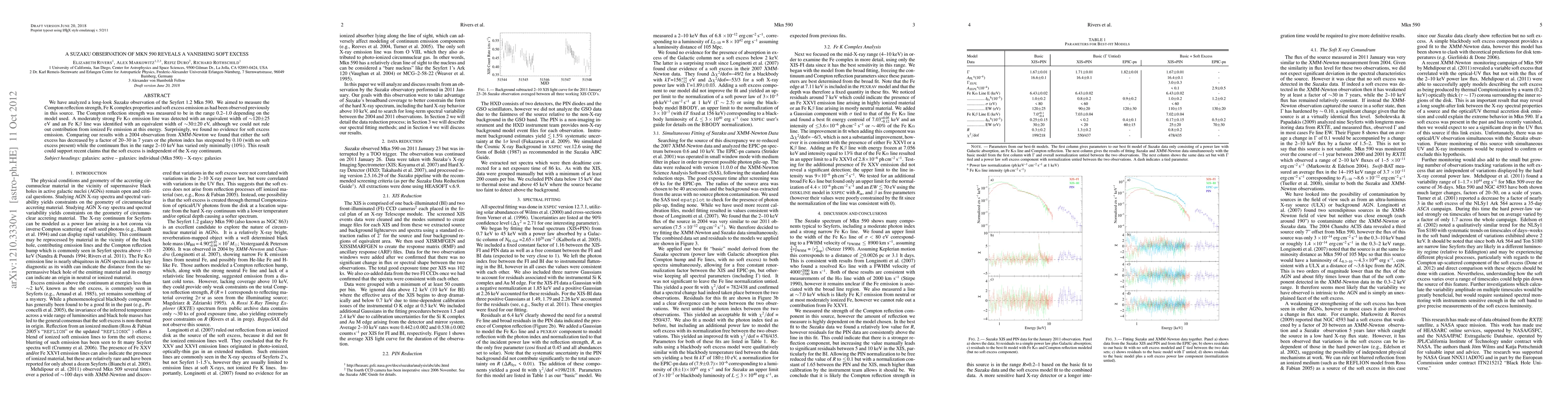We have analyzed a long-look Suzaku observation of the Seyfert 1.2 Mkn~590. We aimed to measure the Compton reflection strength, Fe K complex properties and soft excess emission as had been observed previously in this source. The Compton reflection strength was measured to be in the range 0.2-1.0 depending on the model used. A moderately strong Fe \ka emission line was detected with an equivalent width of ~120+/-25 eV and an Fe Kb line was identified with an equivalent width of ~30+/-20 eV, although we could not rule out contribution from ionized Fe emission at this energy. Surprisingly, we found no evidence for soft excess emission. Comparing our results with a 2004 observation from XMM-Newton we found that either the soft excess has decreased by a factor of 20-30 in 7 years or the photon index has steepened by 0.10 (with no soft excess present) while the continuum flux in the range 2-10 keV has varied only minimally (10%). This result could support recent claims that the soft excess is independent of the X-ray continuum.