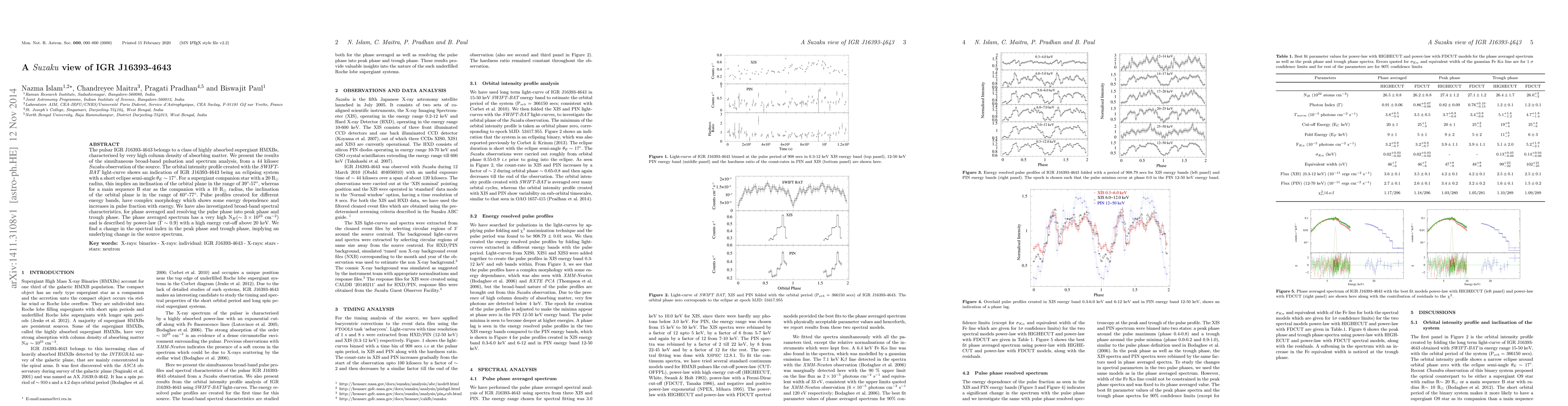 Researchers analyzed data from a 44 kilosec Suzaku observation of IGR J16393-4643, a highly absorbed supergiant HMXB, finding evidence for an eclipsing system with a short eclipse semi-angle and complex pulse profiles that show energy dependence.
