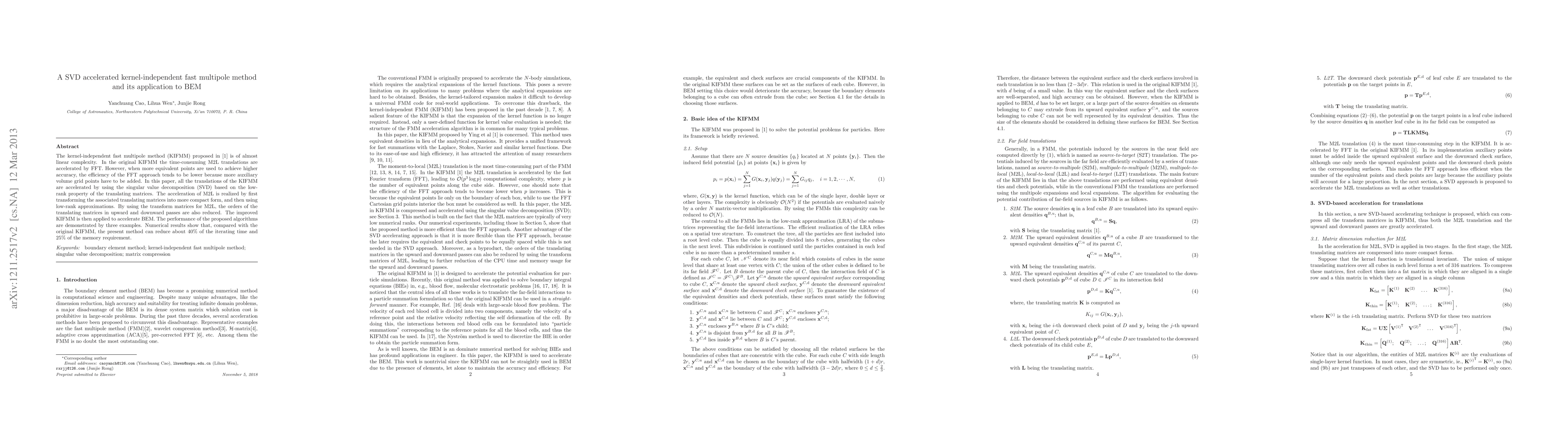 This paper proposes an SVD accelerated kernel-independent fast multipole method (KIFMM) that enhances the efficiency of M2L translations using singular value decomposition. The method reduces iterating time and memory requirements by approximately 40% and 25% respectively, and is applied to accelerate boundary element method (BEM).