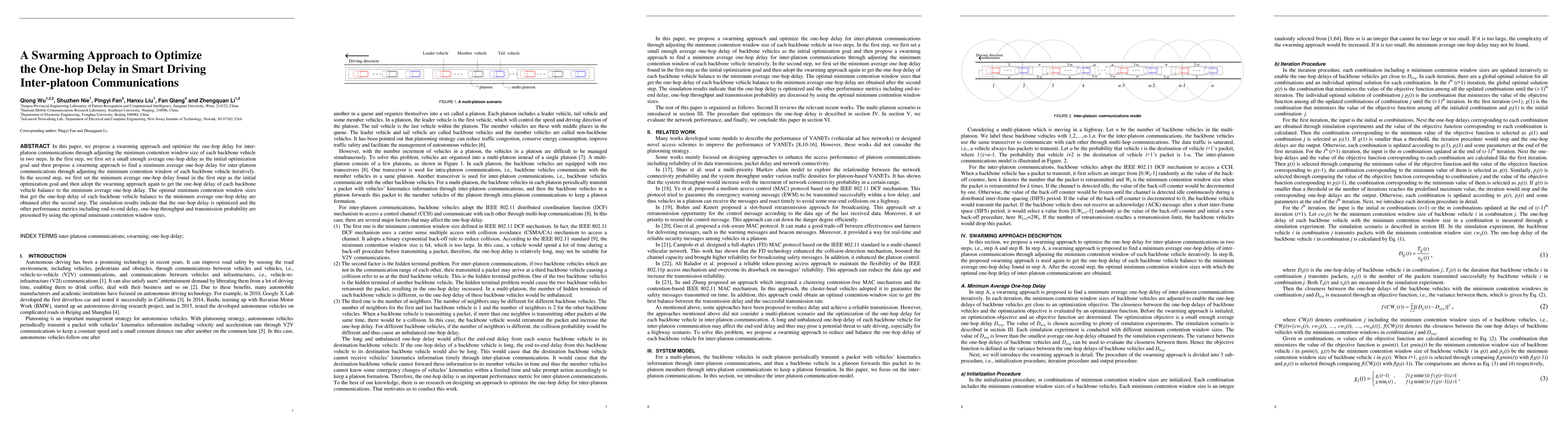 In this paper, we propose a swarming approach and optimize the one-hop delay for interplatoon communications through adjusting the minimum contention window size of each backbone vehicle in two steps. In the first step, we first set a small enough average one-hop delay as the initial optimization goal and then propose a swarming approach to find a minimum average one-hop delay for inter-platoon communications through adjusting the minimum contention window of each backbone vehicle iteratively. In the second step, we first set the minimum average one-hop delay found in the first step as the initial optimization goal and then adopt the swarming approach again to get the one-hop delay of each backbone vehicle balance to the minimum average one-hop delay. The optimal minimum contention window sizes that get the one-hop delay of each backbone vehicle balance to the minimum average one-hop delay are obtained after the second step. The simulation results indicate that the one-hop delay is optimized and the other performance metrics including end-to-end delay, one-hop throughput and transmission probability are presented by using the optimal minimum contention window sizes.