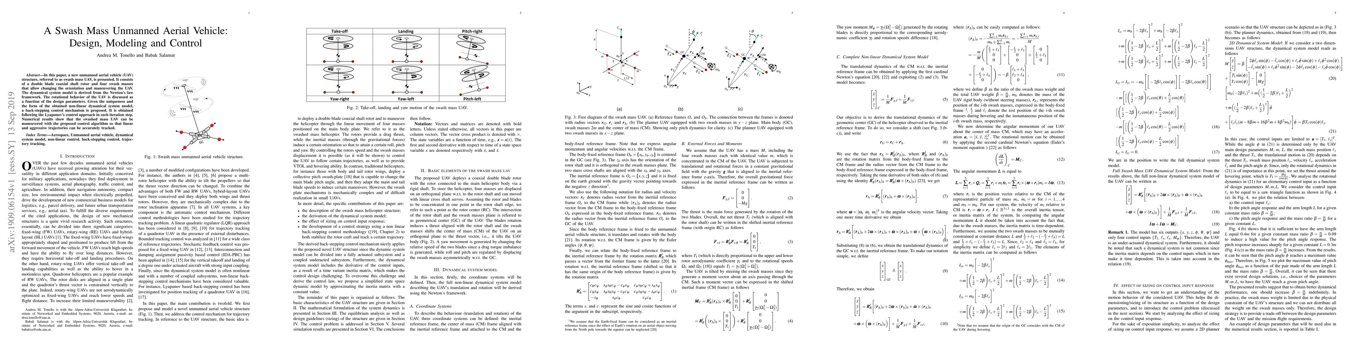 A new type of unmanned aerial vehicle called a swash mass UAV is designed with changing orientation and maneuvering capabilities through its unique rotor structure. The proposed control algorithm allows for accurate tracking of linear and aggressive trajectories.