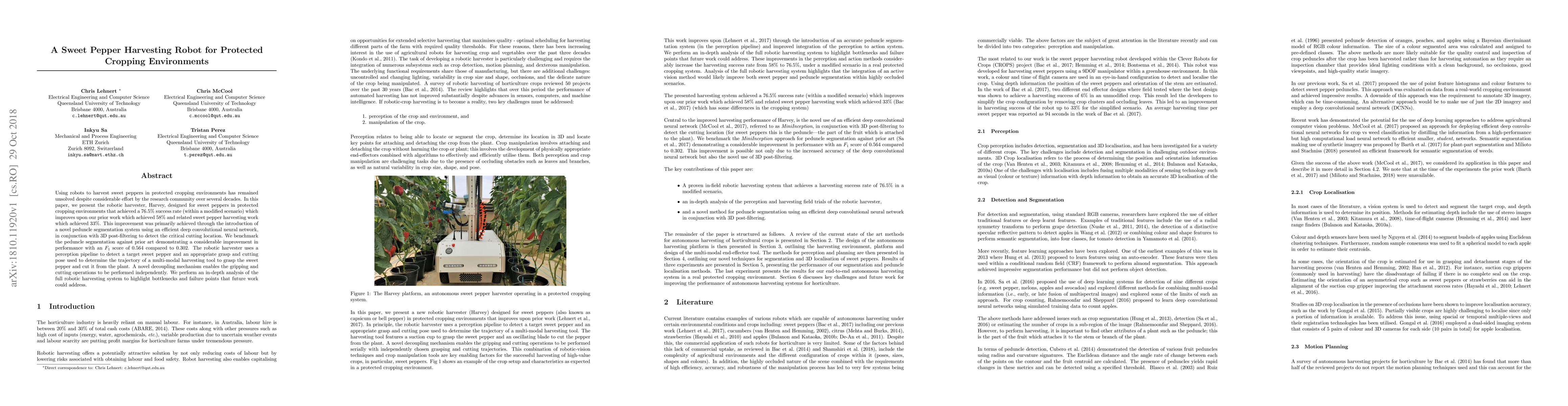 This paper introduces Harvey, a robotic harvester for sweet peppers in protected cropping environments, achieving a 76.5% success rate, significantly better than prior work. The improvement is due to a novel peduncle segmentation system using deep convolutional neural networks and 3D post-filtering.