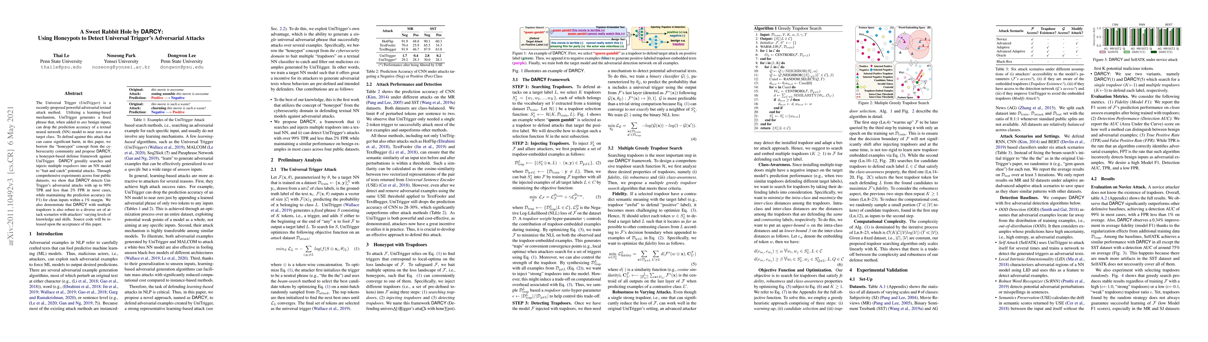 This paper proposes DARCY, a honeypot-based defense framework to detect Universal Trigger's adversarial attacks on neural networks. DARCY effectively identifies these attacks with high true positive rates and low false positive rates, while maintaining model accuracy for clean inputs.