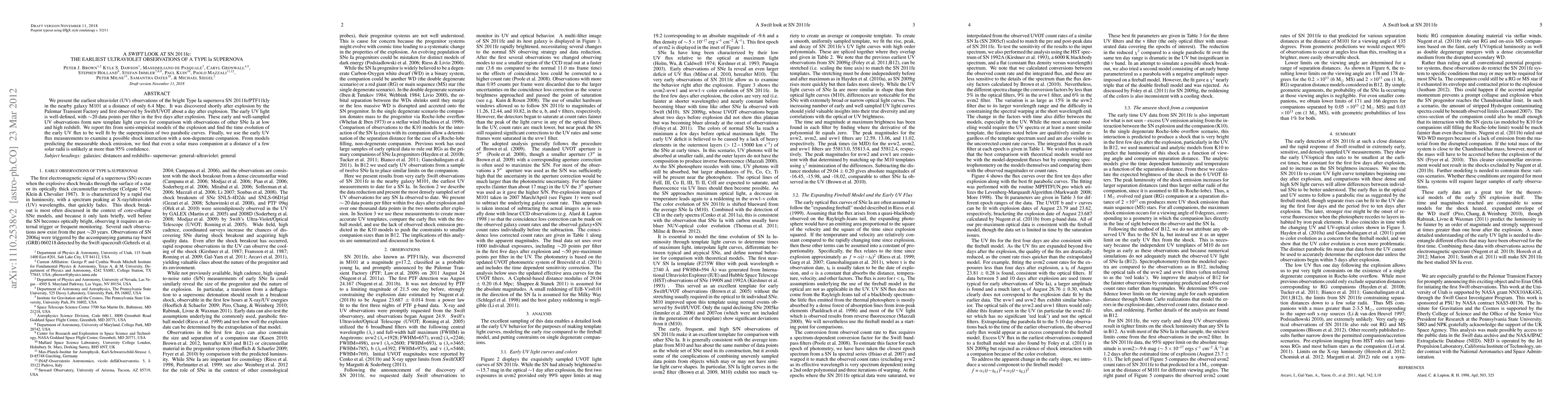 This paper presents the earliest ultraviolet observations of the Type Ia supernova SN 2011fe, providing well-defined light curves for comparison with other SNe Ia. The study finds the early UV flux evolution fits well with two parabolic curves and rules out a nearby non-degenerate companion with high confidence.