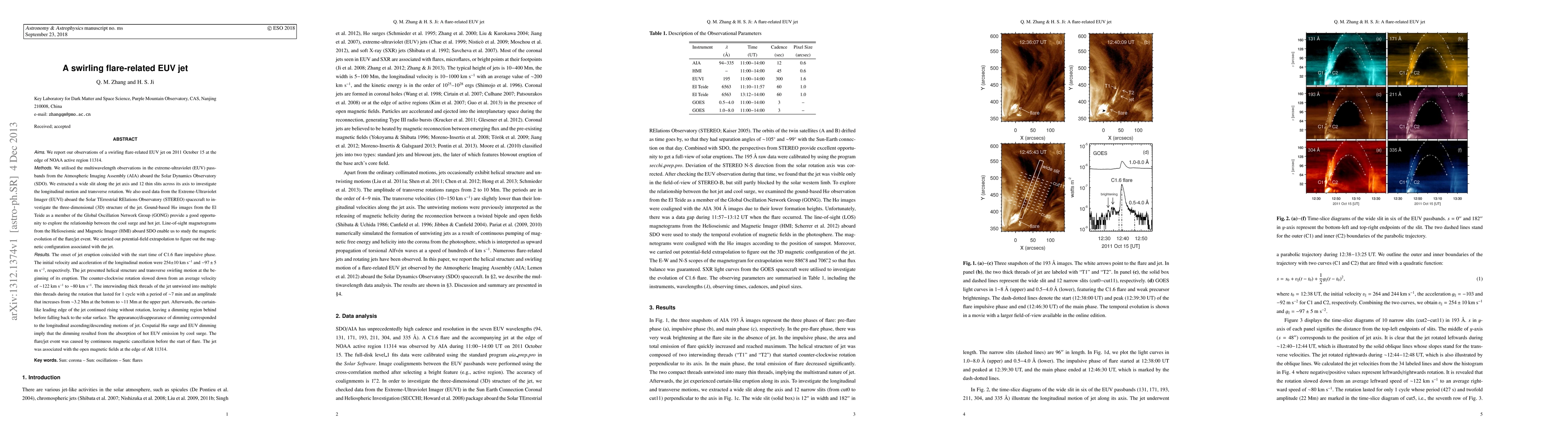 {We report our observations of a swirling flare-related EUV jet on 2011 October 15.} {We utilised the EUV observations from SDO/AIA. We extracted a wide slit along the jet axis and 12 thin slits across its axis to investigate the longitudinal motion and transverse rotation. We also used data from STEREO/EUVI to investigate the 3D structure of the jet. Gound-based H$\alpha$ images provide a good opportunity to explore the relationship between the cool surge and hot jet. LOS magnetograms from SDO/HMI enable us to study the magnetic evolution of the flare/jet event.} {The onset of jet eruption coincided with the start time of C1.6 flare impulsive phase. The initial velocity and acceleration of the longitudinal motion were 254$\pm10$ km s$^{-1}$ and $-97\pm5$ m s$^{-2}$, respectively. The jet presented helical structure and transverse swirling motion at the beginning of its eruption. The counter-clockwise rotation slowed down from an average velocity of $\sim$122 km s$^{-1}$ to $\sim$80 km s$^{-1}$. The interwinding thick threads of the jet untwisted into multiple thin threads during the rotation that lasted for 1 cycle with a period of $\sim$7 min and an amplitude that increases from $\sim$3.2 Mm at the bottom to $\sim$11 Mm at the upper part. Afterwards, the curtain-like leading edge of the jet continued rising without rotation, leaving a dimming region behind before falling back to the solar surface. The appearance/disappearance of dimming corresponded to the longitudinal ascending/descending motions of jet. Cospatial H$\alpha$ surge and EUV dimming imply that the dimming resulted from the absorption of hot EUV emission by cool surge. The flare/jet event was caused by continuous magnetic cancellation before the start of flare. The jet was associated with the open magnetic fields at the edge of AR 11314.}