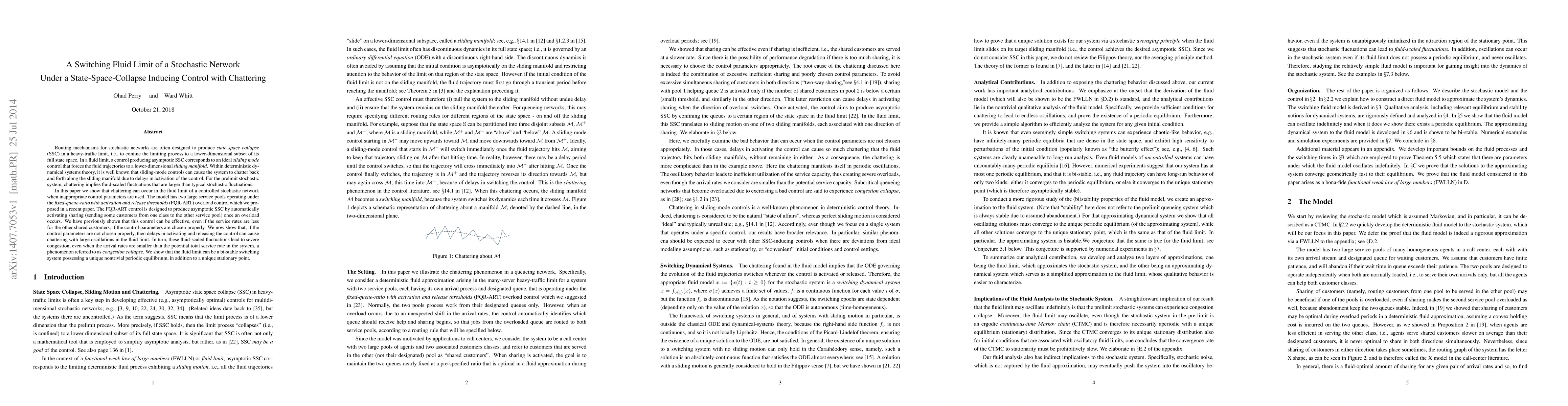 Routing mechanisms for stochastic networks are often designed to produce state space collapse (SSC) in a heavy-traffic limit, i.e., to confine the limiting process to a lower-dimensional subset of its full state space. In a fluid limit, a control producing asymptotic SSC corresponds to an ideal sliding mode control that forces the fluid trajectories to a lower-dimensional sliding manifold. Within deterministic dynamical systems theory, it is well known that sliding-mode controls can cause the system to chatter back and forth along the sliding manifold due to delays in activation of the control. For the prelimit stochastic system, chattering implies fluid-scaled fluctuations that are larger than typical stochastic fluctuations. In this paper we show that chattering can occur in the fluid limit of a controlled stochastic network when inappropriate control parameters are used. The model has two large service pools operating under the fixed-queue-ratio with activation and release thresholds (FQR-ART) overload control which we proposed in a recent paper. We now show that, if the control parameters are not chosen properly, then delays in activating and releasing the control can cause chattering with large oscillations in the fluid limit. In turn, these fluid-scaled fluctuations lead to severe congestion, even when the arrival rates are smaller than the potential total service rate in the system, a phenomenon referred to as congestion collapse. We show that the fluid limit can be a bi-stable switching system possessing a unique nontrivial periodic equilibrium, in addition to a unique stationary point.