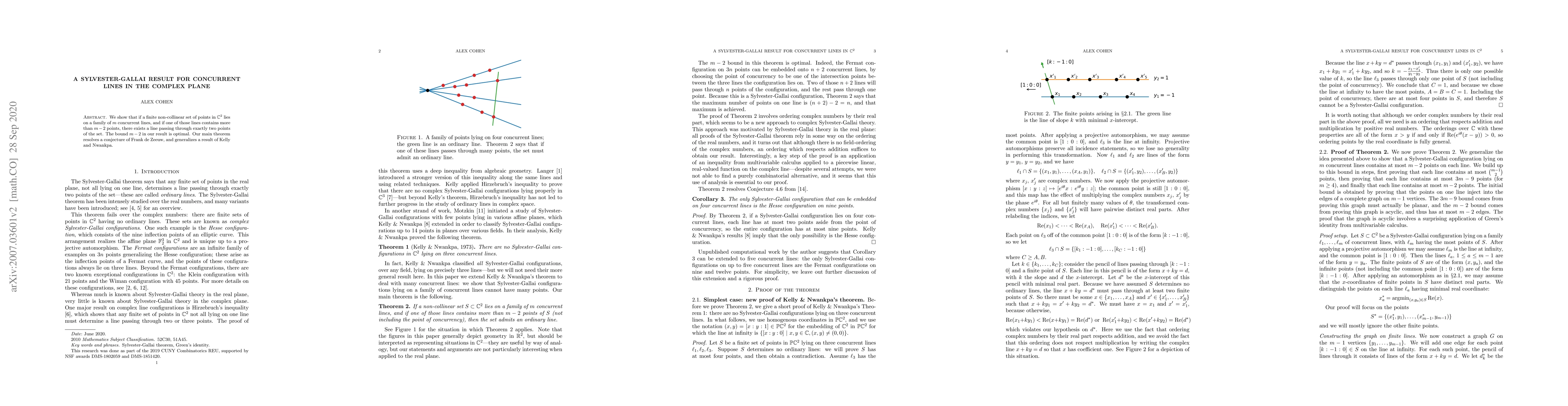 We show that if a set of points in $\mathbb{C}^2$ lies on a family of $m$ concurrent lines, and if one of those lines contains more than $m-2$ points, then there is a line passing through exactly two points of the set. The bound $m-2$ in our result is optimal. Our main theorem resolves a conjecture of Frank de Zeeuw, and generalizes a result of Kelly and Nwankpa.