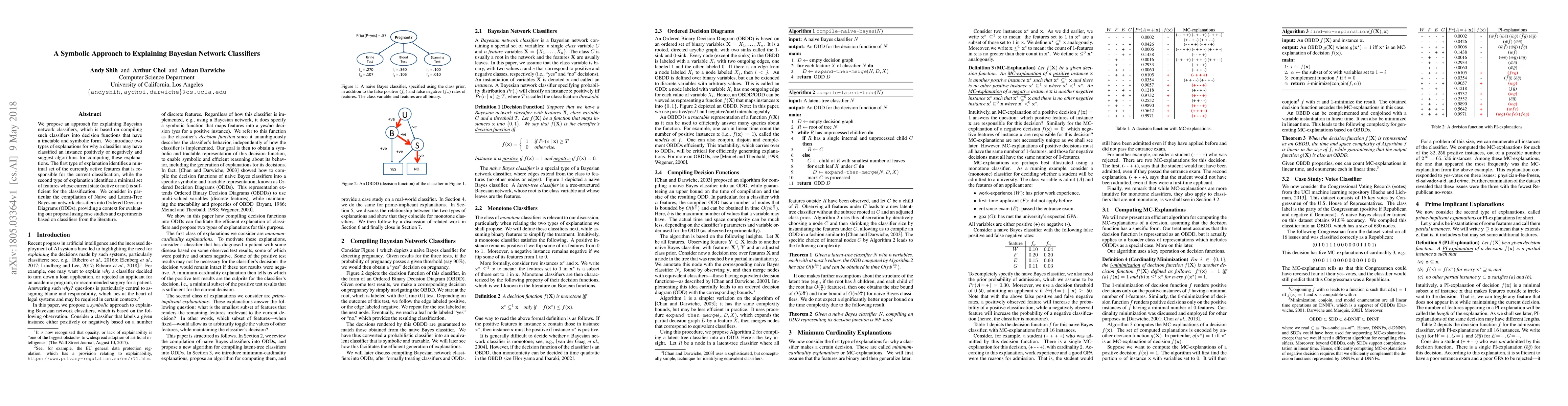 We propose an approach for explaining Bayesian network classifiers, which is based on compiling such classifiers into decision functions that have a tractable and symbolic form. We introduce two types of explanations for why a classifier may have classified an instance positively or negatively and suggest algorithms for computing these explanations. The first type of explanation identifies a minimal set of the currently active features that is responsible for the current classification, while the second type of explanation identifies a minimal set of features whose current state (active or not) is sufficient for the classification. We consider in particular the compilation of Naive and Latent-Tree Bayesian network classifiers into Ordered Decision Diagrams (ODDs), providing a context for evaluating our proposal using case studies and experiments based on classifiers from the literature.