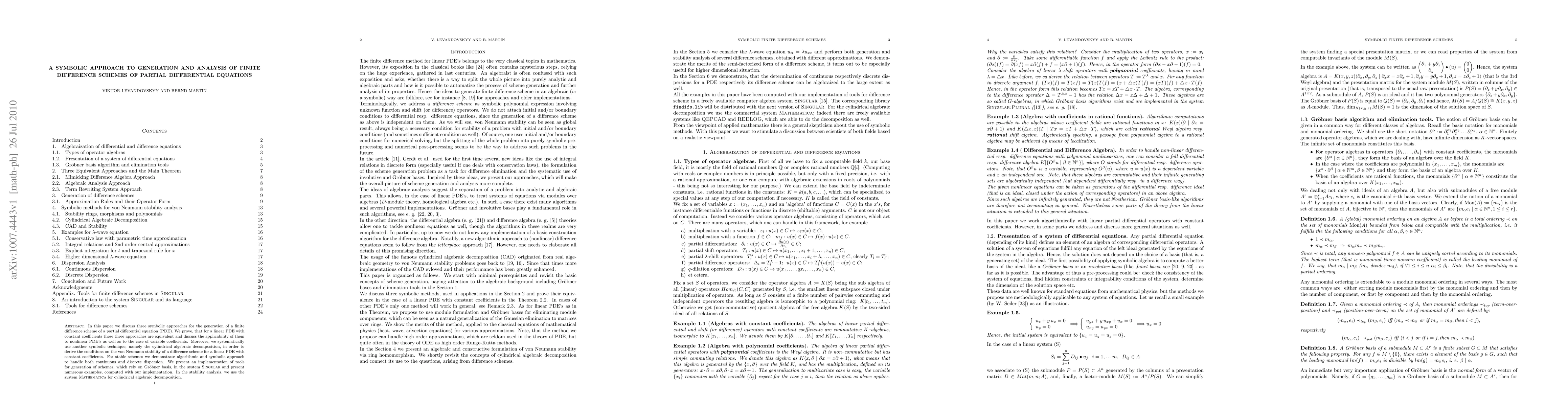 In this paper we discuss three symbolic approaches for the generation of a finite difference scheme of a partial differential equation (PDE). We prove, that for a linear PDE with constant coefficients these three approaches are equivalent and discuss the applicability of them to nonlinear PDE's as well as to the case of variable coefficients. Moreover, we systematically use another symbolic technique, namely the cylindrical algebraic decomposition, in order to derive the conditions on the von Neumann stability of a difference s cheme for a linear PDE with constant coefficients. For stable schemes we demonst rate algorithmic and symbolic approach to handle both continuous and discrete di spersion. We present an implementation of tools for generation of schemes, which rely on Gr\"obner basis, in the system SINGULAR and present numerous e xamples, computed with our implementation. In the stability analysis, we use the system MATHEMATICA for cylindrical algebraic decomposition.