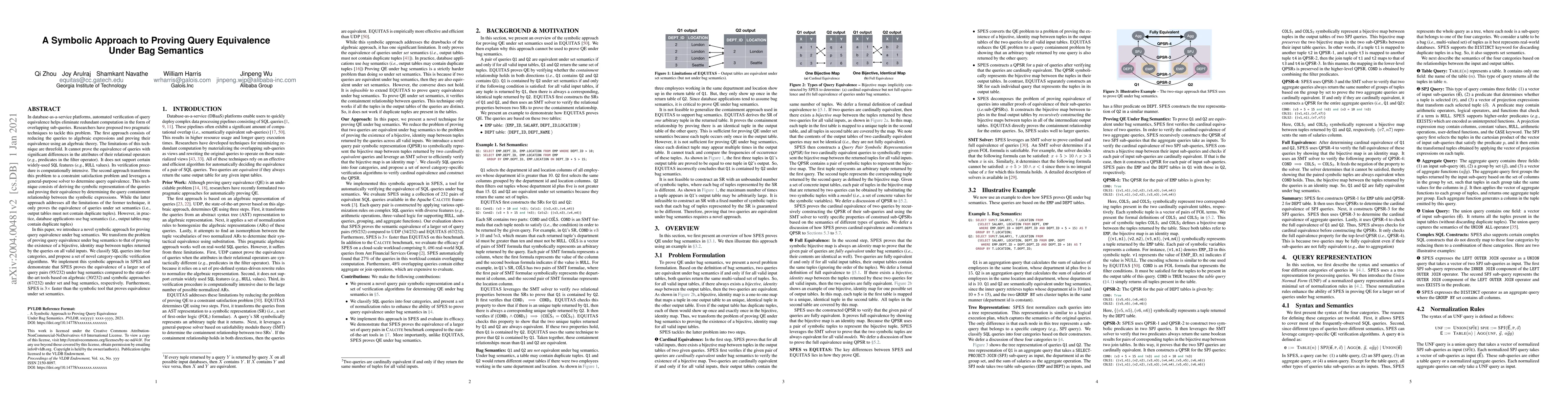 In database-as-a-service platforms, automated verification of query equivalence helps eliminate redundant computation in the form of overlapping sub-queries. Researchers have proposed two pragmatic techniques to tackle this problem. The first approach consists of reducing the queries to algebraic expressions and proving their equivalence using an algebraic theory. The limitations of this technique are threefold. It cannot prove the equivalence of queries with significant differences in the attributes of their relational operators. It does not support certain widely-used SQL features. Its verification procedure is computationally intensive. The second approach transforms this problem to a constraint satisfaction problem and leverages a general-purpose solver to determine query equivalence. This technique consists of deriving the symbolic representation of the queries and proving their equivalence by determining the query containment relationship between the symbolic expressions. While the latter approach addresses all the limitations of the former technique, it only proves the equivalence of queries under set semantics. However, in practice, database applications use bag semantics. In this paper, we introduce a novel symbolic approach for proving query equivalence under bag semantics. We transform the problem of proving query equivalence under bag semantics to that of proving the existence of a bijective, identity map between tuples returned by the queries on all valid inputs. We implement this symbolic approach in SPES and demonstrate that SPES proves the equivalence of a larger set of query pairs (95/232) under bag semantics compared to the state-of-the-art tools based on algebraic (30/232) and symbolic approaches (67/232) under set and bag semantics, respectively. Furthermore, SPES is 3X faster than the symbolic tool that proves equivalence under set semantics.