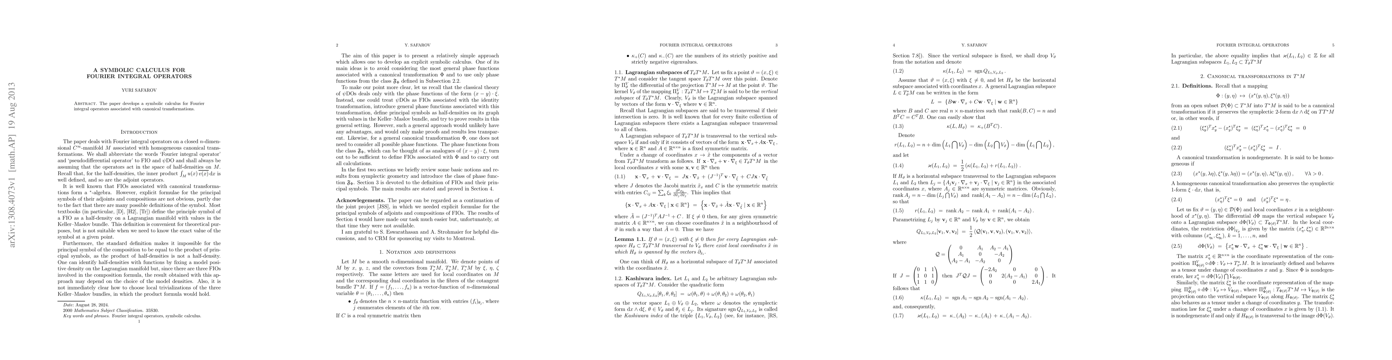 Summary: This paper introduces a symbolic calculus for Fourier integral operators linked to canonical transformations, providing a framework for analyzing and manipulating these operators in mathematical and physical contexts.