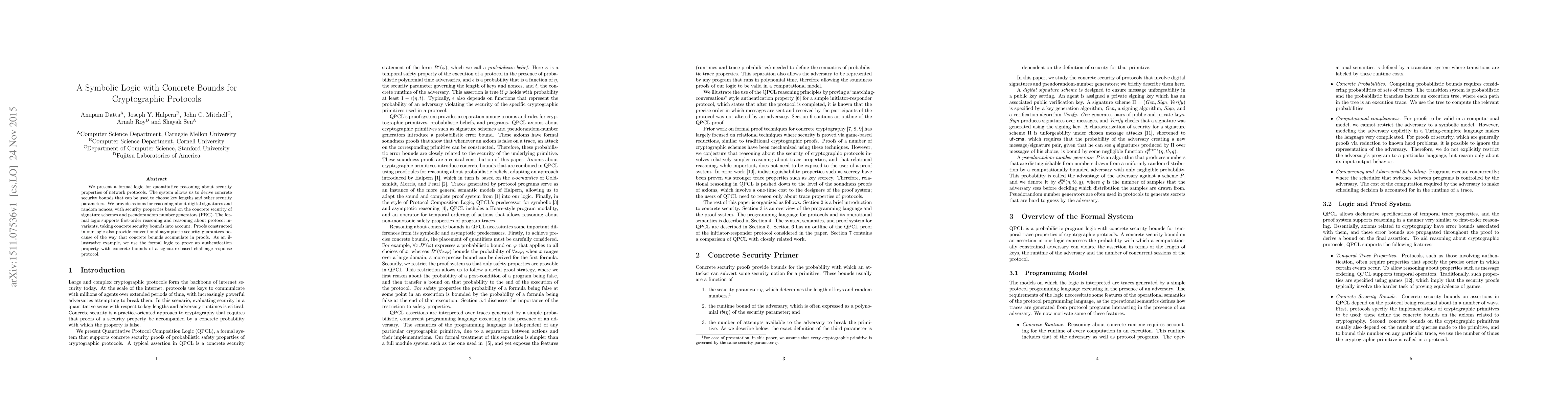 This paper introduces a formal logic for quantitatively assessing security properties of network protocols, enabling the derivation of concrete security bounds for choosing key lengths. The logic supports first-order reasoning and includes axioms for digital signatures and random nonces, providing both concrete security bounds and conventional asymptotic security guarantees.