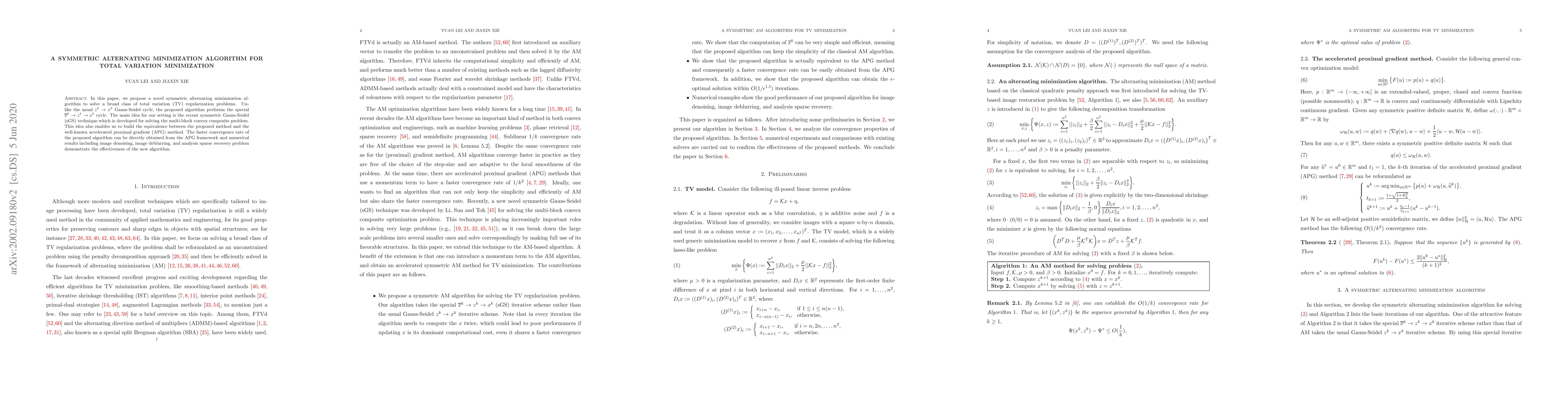 This paper introduces a symmetric alternating minimization algorithm for total variation minimization, utilizing a $\overline{x}^{k}\to z^k\to x^k$ cycle instead of the traditional Gauss-Seidel method. The proposed method, inspired by the symmetric Gauss-Seidel technique, demonstrates faster convergence and is shown to be equivalent to the accelerated proximal gradient method, with effective applications in image denoising, deblurring, and sparse recovery.