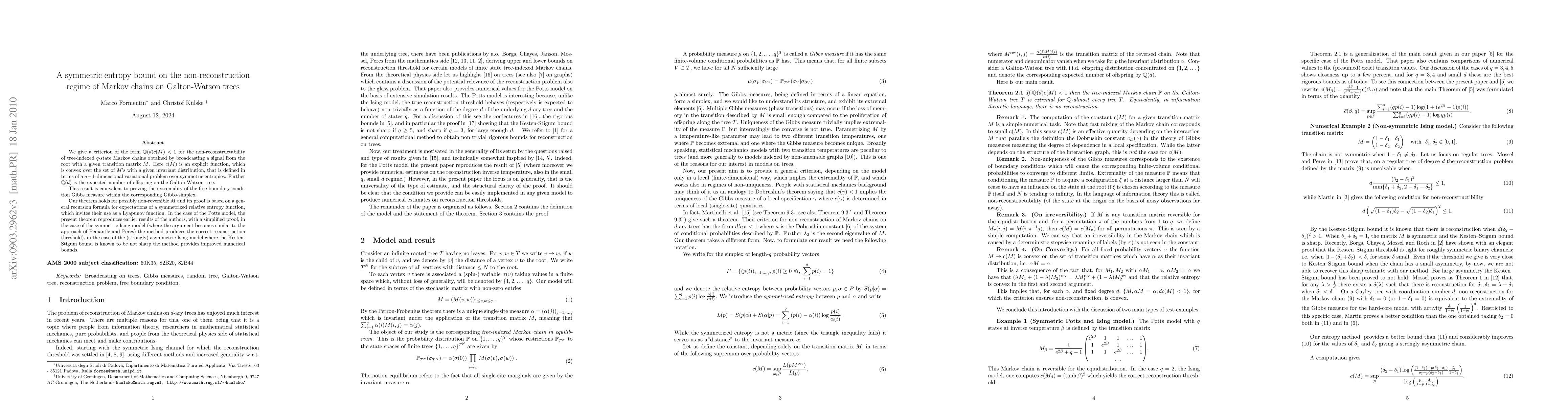 We give a criterion of the form Q(d)c(M)<1 for the non-reconstructability of tree-indexed q-state Markov chains obtained by broadcasting a signal from the root with a given transition matrix M. Here c(M) is an explicit function, which is convex over the set of M's with a given invariant distribution, that is defined in terms of a (q-1)-dimensional variational problem over symmetric entropies. Further Q(d) is the expected number of offspring on the Galton-Watson tree. This result is equivalent to proving the extremality of the free boundary condition-Gibbs measure within the corresponding Gibbs-simplex. Our theorem holds for possibly non-reversible M and its proof is based on a general Recursion Formula for expectations of a symmetrized relative entropy function, which invites their use as a Lyapunov function. In the case of the Potts model, the present theorem reproduces earlier results of the authors, with a simplified proof, in the case of the symmetric Ising model (where the argument becomes similar to the approach of Pemantle and Peres) the method produces the correct reconstruction threshold), in the case of the (strongly) asymmetric Ising model where the Kesten-Stigum bound is known to be not sharp the method provides improved numerical bounds.