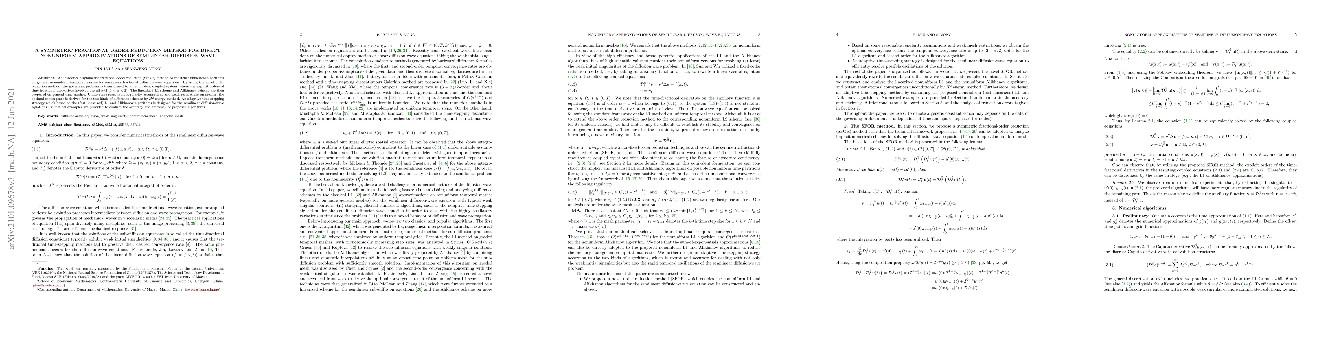 This paper introduces a symmetric fractional-order reduction (SFOR) method to develop numerical algorithms for semilinear fractional diffusion-wave equations on nonuniform meshes. The method transforms the problem into an equivalent system with reduced fractional orders, enabling the use of the L1 and Alikhanov schemes, and achieving optimal convergence.