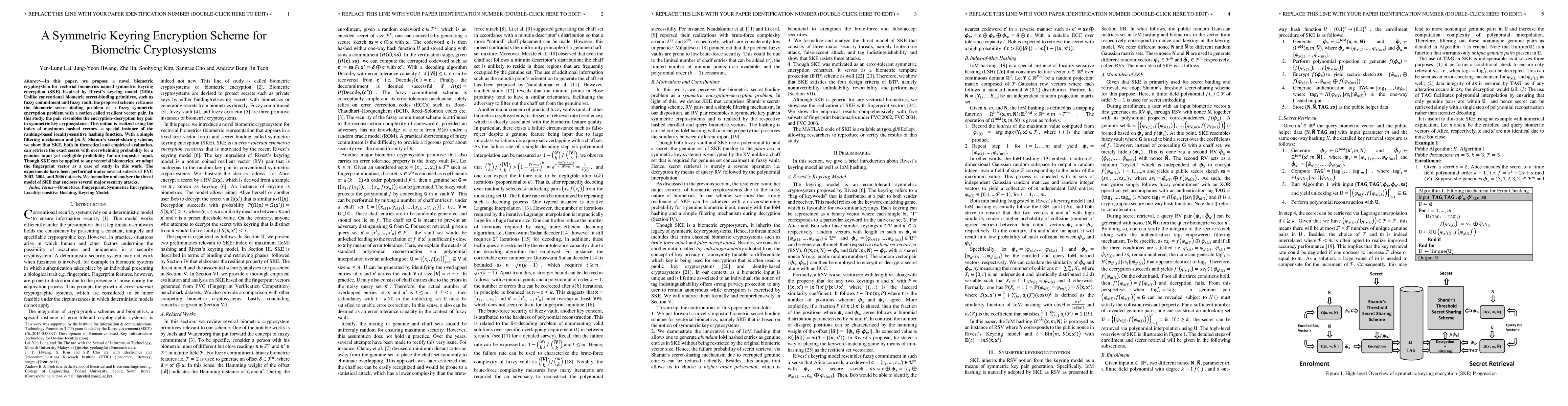 A new biometric encryption scheme called symmetric keyring encryption (SKE) is proposed for secure handling of biometric data, offering high accuracy for genuine inputs and negligible probability for imposter inputs.
