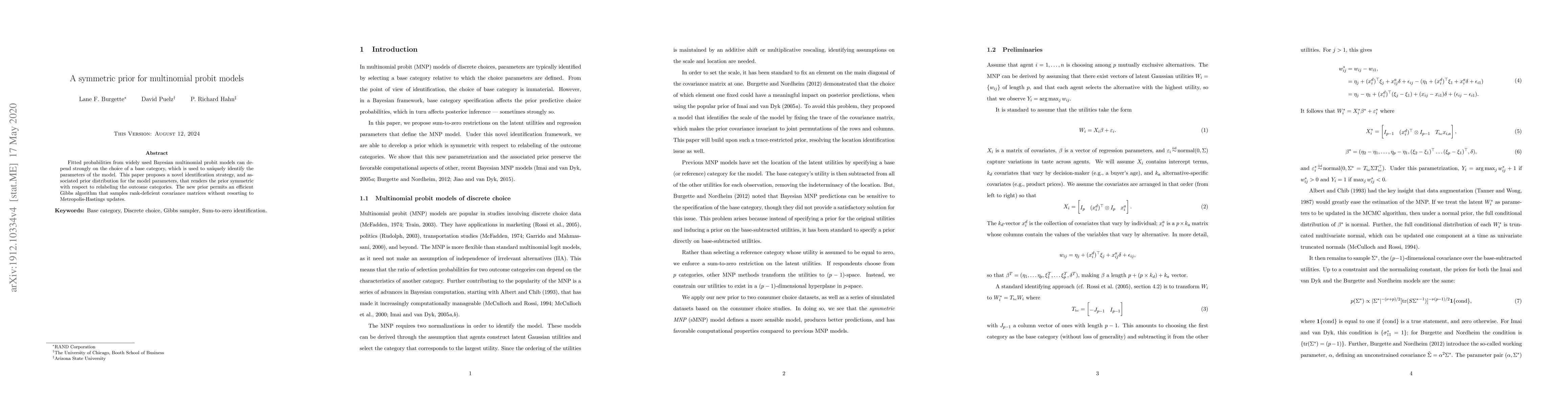 This paper proposes a symmetric prior for Bayesian multinomial probit models to eliminate the strong dependence of fitted probabilities on the choice of base category. It introduces an identification strategy and a prior distribution that allows for an efficient Gibbs sampling algorithm without the need for Metropolis-Hastings updates.