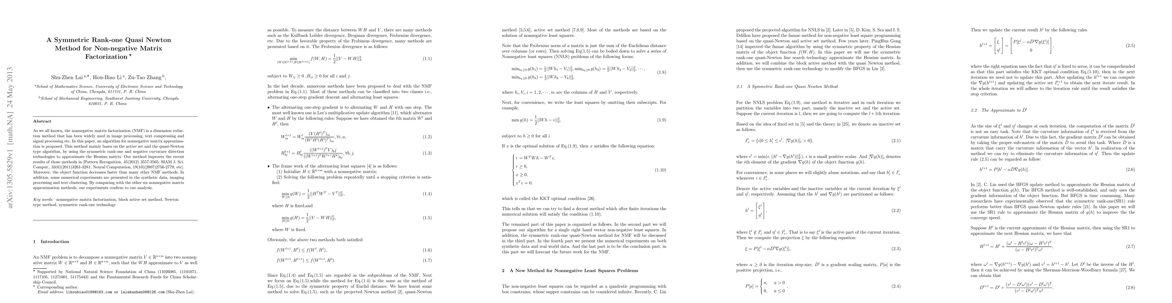 This paper proposes a symmetric rank-one quasi-Newton method for nonnegative matrix factorization, improving upon existing methods by faster objective function decrease and enhanced approximation techniques. Numerical experiments in image processing, text clustering, and synthetic data validate the method's effectiveness.