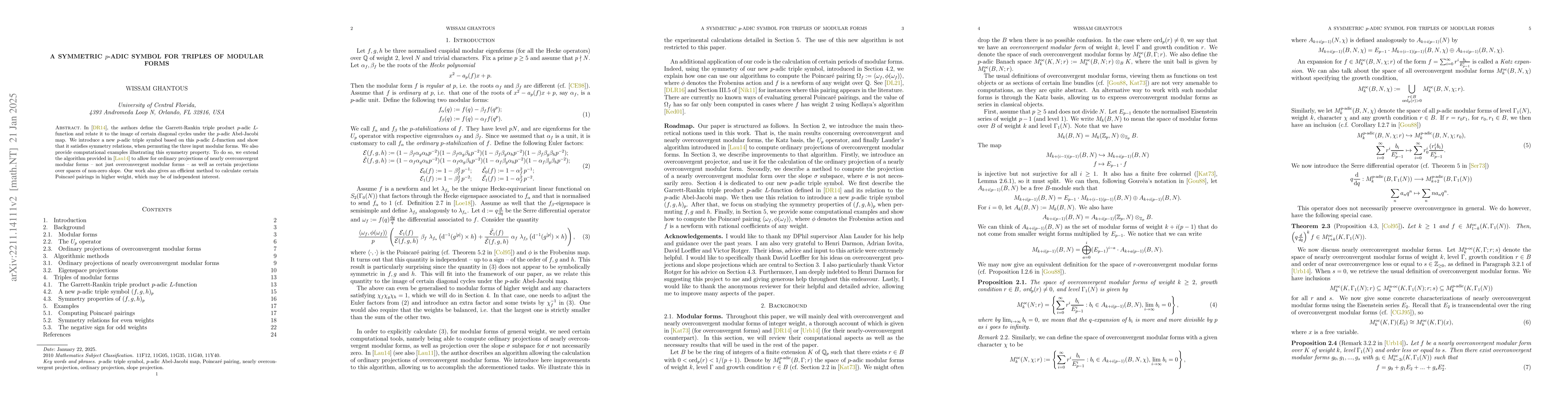 This paper introduces a symmetric variant of the Garrett-Rankin triple product $p$-adic $L$-function, demonstrating its symmetry under permutations of modular forms and providing computational evidence for its cyclicity at even weights. It extends existing algorithms to handle ordinary projections of nearly overconvergent modular forms.