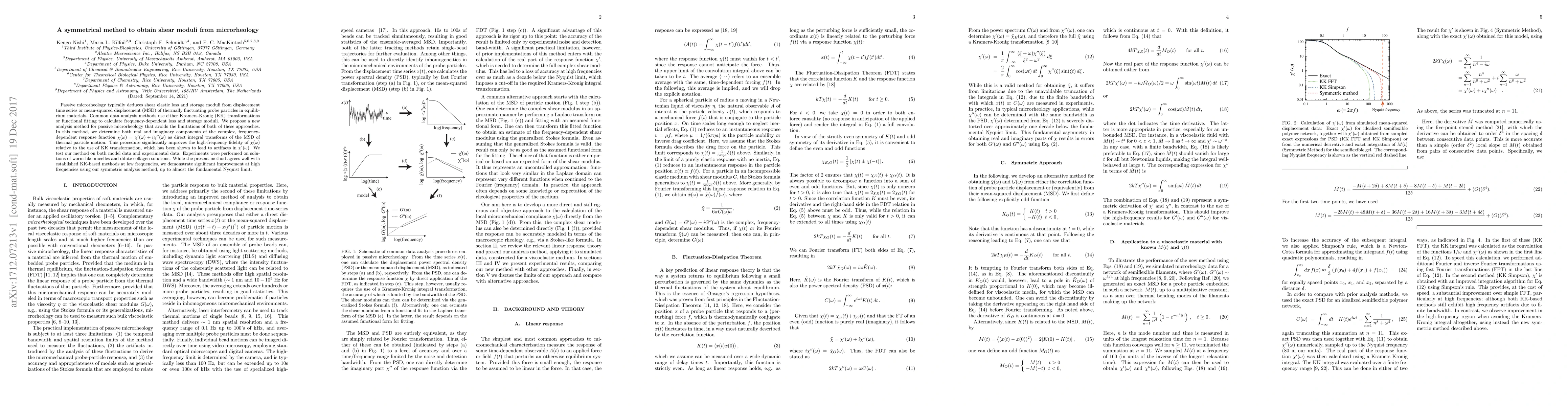 Passive microrheology typically deduces shear elastic loss and storage moduli from displacement time series or mean-squared displacement (MSD) of thermally fluctuating probe particles in equilibrium materials. Common data analysis methods use either Kramers-Kronig (KK) transformations or functional fitting to calculate frequency-dependent loss and storage moduli. We propose a new analysis method for passive microrheology that avoids the limitations of both of these approaches. In this method, we determine both real and imaginary components of the complex, frequency-dependent response function $\chi(\omega) = \chi^{\prime}(\omega)+i\chi^{\prime\prime}(\omega)$ as direct integral transforms of the MSD of thermal particle motion. This procedure significantly improves the high-frequency fidelity of $\chi(\omega)$ relative to the use of KK transformation, which has been shown to lead to artifacts in $\chi^{\prime}(\omega)$. We test our method on both model data and experimental data. Experiments were performed on solutions of worm-like micelles and dilute collagen solutions. While the present method agrees well with established KK-based methods at low frequencies, we demonstrate significant improvement at high frequencies using our symmetric analysis method, up to almost the fundamental Nyquist limit.