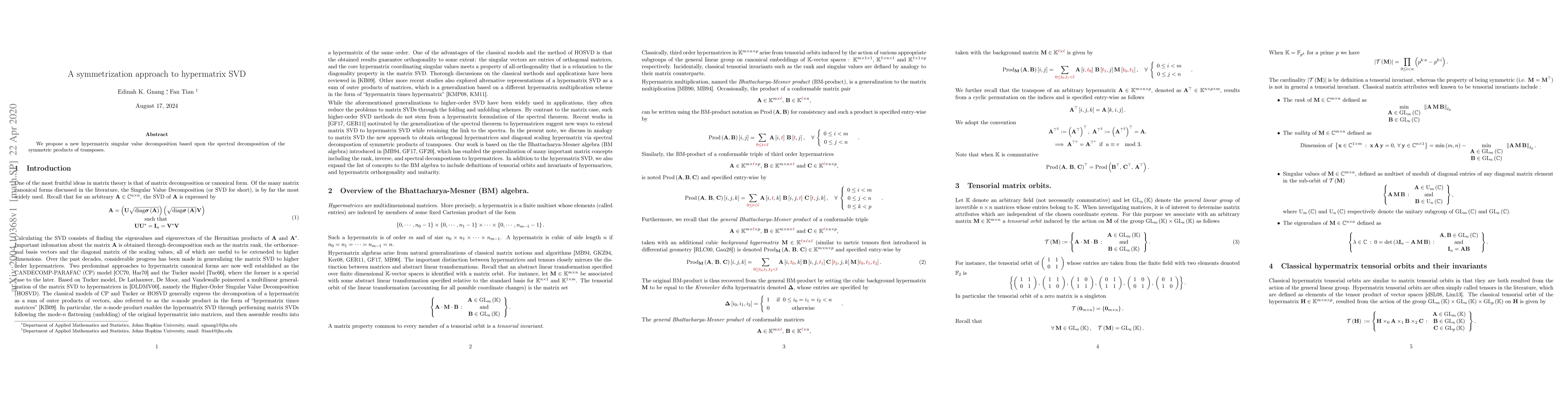 Summary: This paper introduces a novel hypermatrix SVD method utilizing the spectral decomposition of symmetric products of transposes, aiming to enhance the decomposition process. The approach promises improved accuracy and efficiency in hypermatrix analysis.