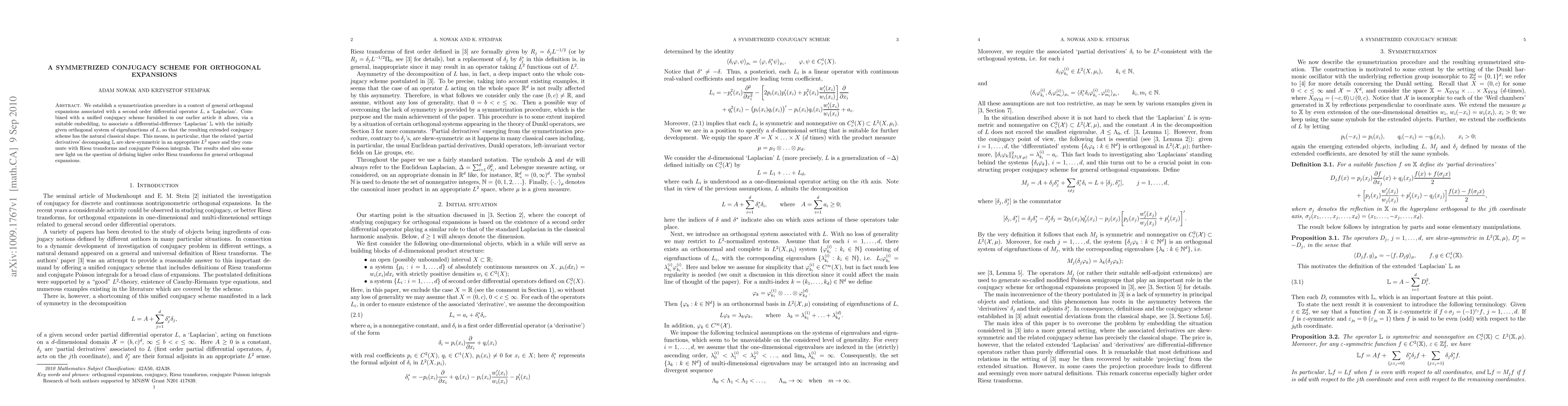 This paper introduces a symmetrization method for orthogonal expansions linked with a Laplacian-like operator, enhancing a previous conjugacy scheme. The approach generates a differential-difference Laplacian, ensuring skew-symmetry and commutativity with Riesz transforms and conjugate Poisson integrals, which also illuminates higher-order Riesz transform definitions for general orthogonal expansions.