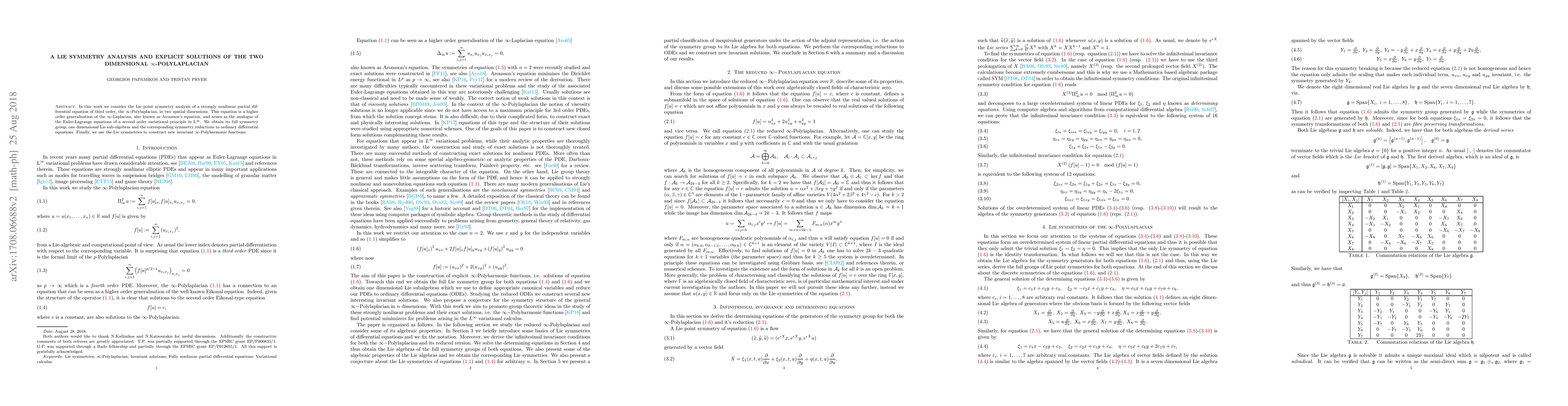 In this work we use Lie group theoretic methods and the theory of prolonged group actions to study two fully nonlinear partial differential equations (PDEs). First we consider a third order PDE in two spatial dimensions that arises as the analogue of the Euler-Lagrange equations from a second order variational principle in $L^{\infty}$. The equation, known as the $\infty$-Polylaplacian, is a higher order generalisation of the $\infty$-Laplacian, also known as Aronsson's equation. In studying this problem we consider a reduced equation whose relation to the $\infty$-Polylaplacian can be considered analogous to the relationship of the Eikonal to Aronsson's equation. Solutions of the reduced equation are also solutions of the $\infty$-Polylaplacian. For the first time we study the Lie symmetries admitted by these two problems and use them to characterise and construct invariant solutions under the action of one dimensional symmetry subgroups.