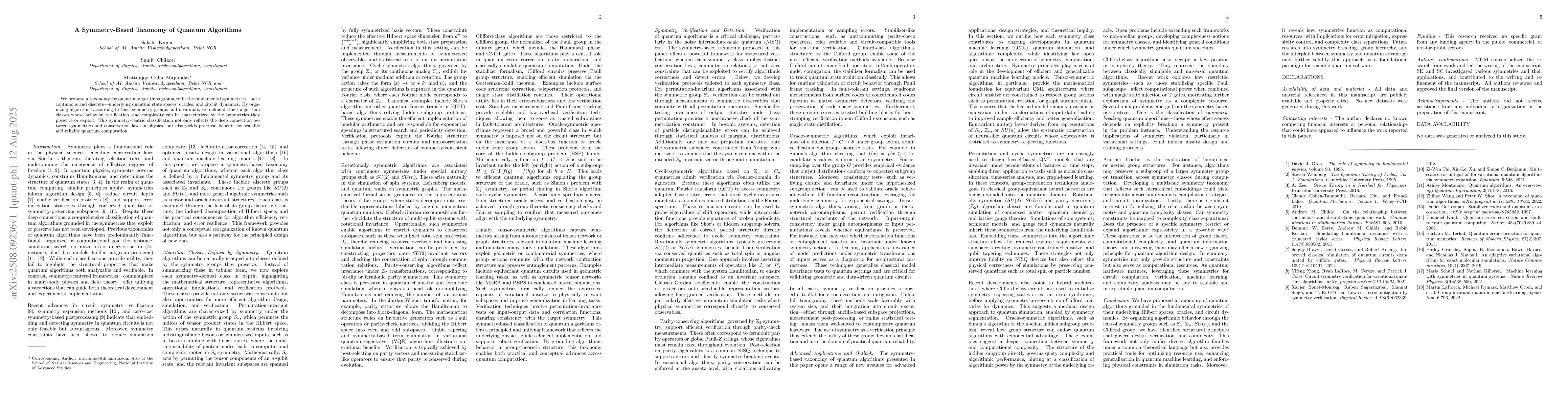 We propose a taxonomy for quantum algorithms grounded in the fundamental symmetries, both continuous and discrete, underlying quantum state spaces, oracles, and circuit dynamics. By organizing algorithms according to their symmetry groups and invariants, we define distinct algorithm classes whose behavior, verification, and complexity can be characterized by the symmetries they preserve or exploit. This symmetry-centric classification not only reflects the deep connection between symmetries and conservation laws in physics, but also yields practical benefits for scalable and reliable quantum computation.
