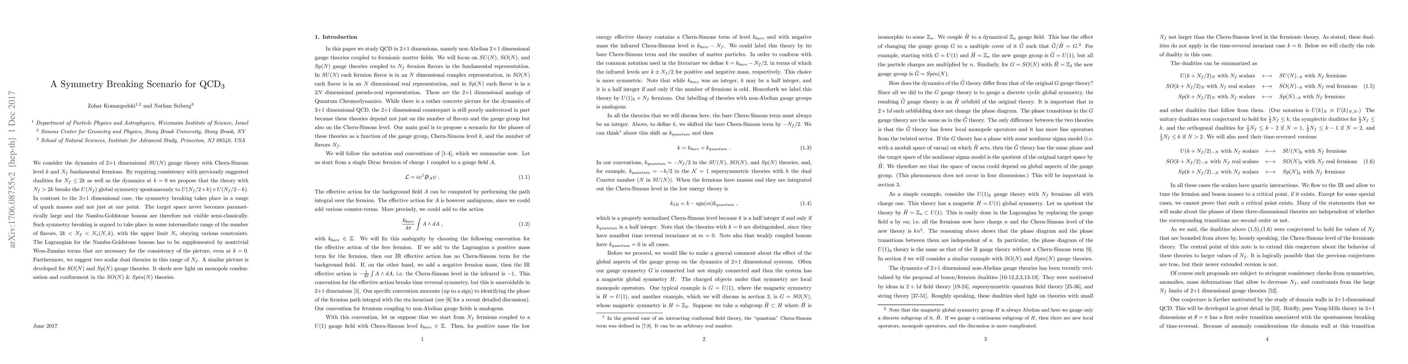 We consider the dynamics of 2+1 dimensional $SU(N)$ gauge theory with Chern-Simons level $k$ and $N_f$ fundamental fermions. By requiring consistency with previously suggested dualities for $N_f\leq 2k$ as well as the dynamics at $k=0$ we propose that the theory with $N_f> 2k$ breaks the $U(N_f)$ global symmetry spontaneously to $U(N_f/2+k)\times U(N_f/2-k)$. In contrast to the 3+1 dimensional case, the symmetry breaking takes place in a range of quark masses and not just at one point. The target space never becomes parametrically large and the Nambu-Goldstone bosons are therefore not visible semi-classically. Such symmetry breaking is argued to take place in some intermediate range of the number of flavors, $2k< N_f< N_*(N,k)$, with the upper limit $N_*$ obeying various constraints. The Lagrangian for the Nambu-Goldstone bosons has to be supplemented by nontrivial Wess-Zumino terms that are necessary for the consistency of the picture, even at $k=0$. Furthermore, we suggest two scalar dual theories in this range of $N_f$. A similar picture is developed for $SO(N)$ and $Sp(N)$ gauge theories. It sheds new light on monopole condensation and confinement in the $SO(N)$ and $Spin(N)$ theories.