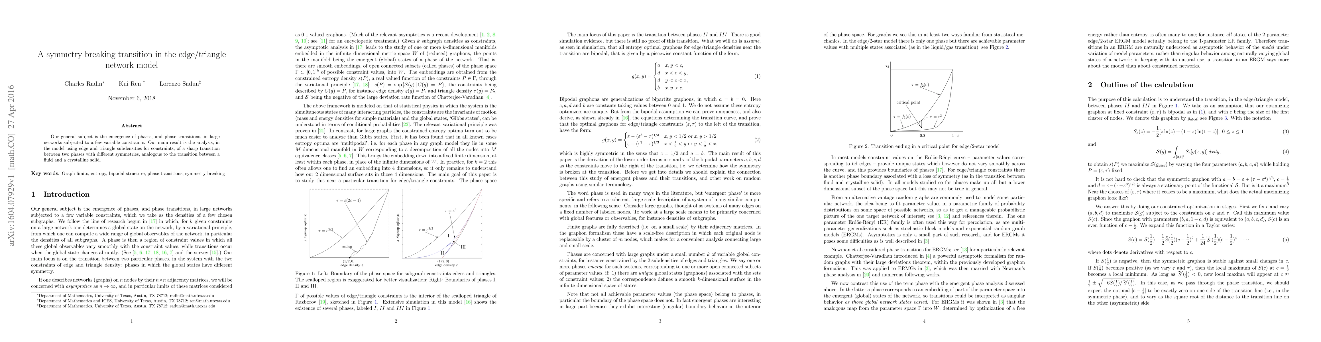 Our general subject is the emergence of phases, and phase transitions, in large networks subjected to a few variable constraints. Our main result is the analysis, in the model using edge and triangle subdensities for constraints, of a sharp transition between two phases with different symmetries, analogous to the transition between a fluid and a crystalline solid.