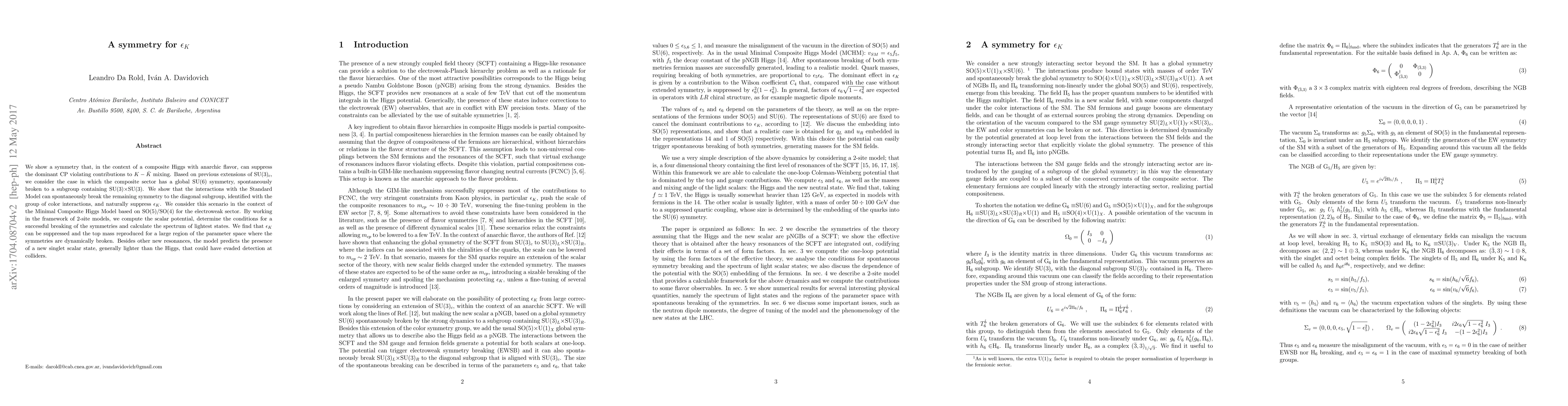 We show a symmetry that, in the context of a composite Higgs with anarchic flavor, can suppress the dominant CP violating contributions to $K-\bar K$ mixing. Based on previous extensions of SU(3)$_c$, we consider the case in which the composite sector has a global SU(6) symmetry, spontaneously broken to a subgroup containing SU(3)$\times$SU(3). We show that the interactions with the Standard Model can spontaneously break the remaining symmetry to the diagonal subgroup, identified with the group of color interactions, and naturally suppress $\epsilon_K$. We consider this scenario in the context of the Minimal Composite Higgs Model based on SO(5)/SO(4) for the electroweak sector. By working in the framework of 2-site models, we compute the scalar potential, determine the conditions for a successful breaking of the symmetries and calculate the spectrum of lightest states. We find that $\epsilon_K$ can be suppressed and the top mass reproduced for a large region of the parameter space where the symmetries are dynamically broken. Besides other new resonances, the model predicts the presence of a new singlet scalar state, generally lighter than the Higgs, that could have evaded detection at colliders.