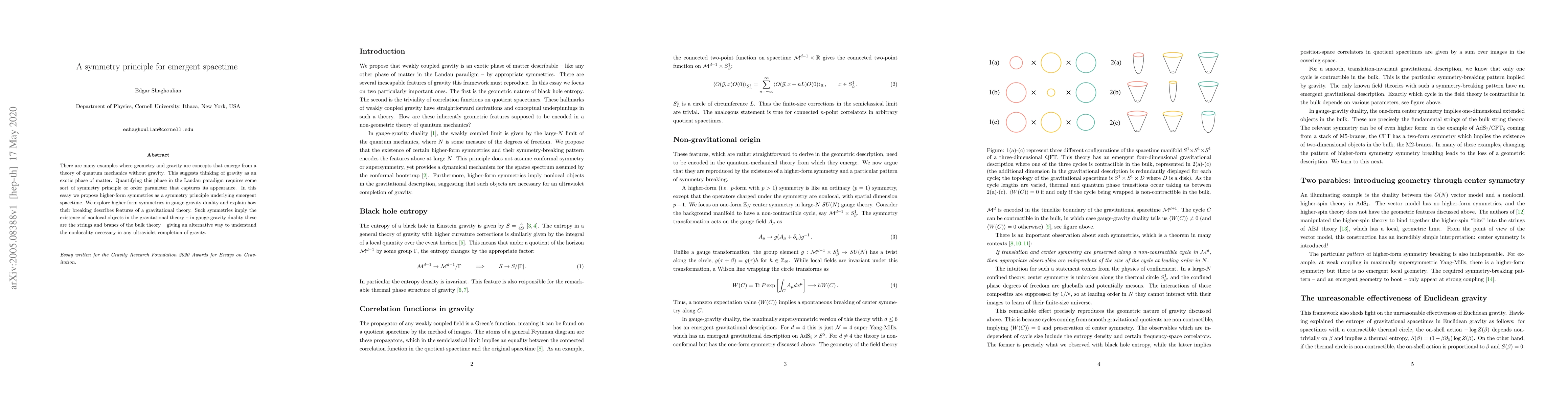 There are many examples where geometry and gravity are concepts that emerge from a theory of quantum mechanics without gravity. This suggests thinking of gravity as an exotic phase of matter. Quantifying this phase in the Landau paradigm requires some sort of symmetry principle or order parameter that captures its appearance. In this essay we propose higher-form symmetries as a symmetry principle underlying emergent spacetime. We explore higher-form symmetries in gauge-gravity duality and explain how their breaking describes features of a gravitational theory. Such symmetries imply the existence of nonlocal objects in the gravitational theory -- in gauge-gravity duality these are the strings and branes of the bulk theory -- giving an alternative way to understand the nonlocality necessary in any ultraviolet completion of gravity.