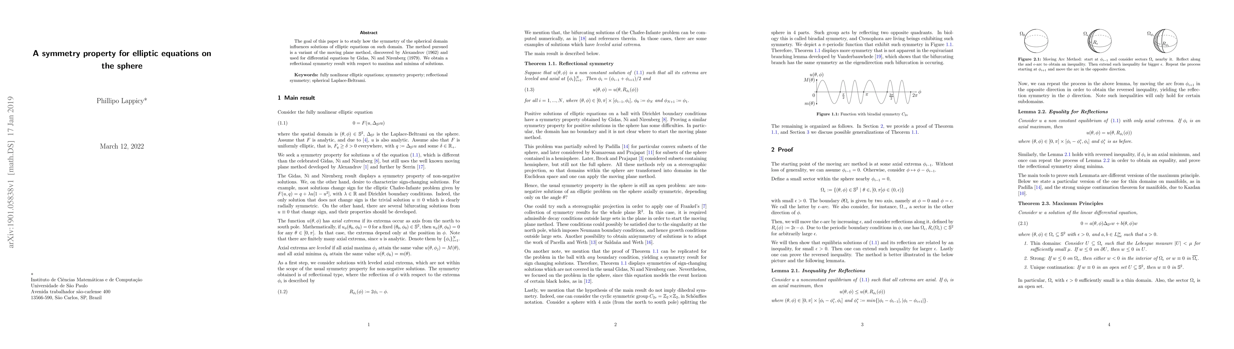 The goal of this paper is to study how the symmetry of the spherical domain influences solutions of elliptic equations on such domain. The method pursued is a variant of the moving plane method, discovered by Alexandrov (1962) and used for differential equations by Gidas, Ni and Nirenberg (1979). We obtain a reflectional symmetry result with respect to maxima and minima of solutions.