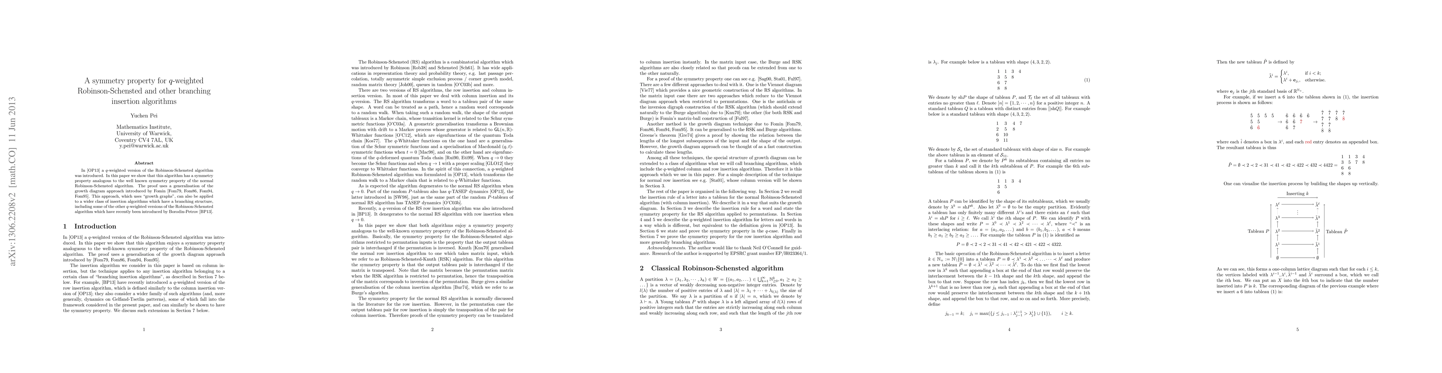 In O'Connell-Pei(2013) a q-weighted version of the Robinson-Schensted algorithm was introduced. In this paper we show that this algorithm has a symmetry property analogous to the well known symmetry property of the normal Robinson-Schensted algorithm. The proof uses a generalisation of the growth diagram approach introduced by Fomin(1979,1986,1994,1995). This approach, which uses "growth graphs", can also be applied to a wider class of insertion algorithms which have a branching structure, including some of the other q-weighted versions of the Robinson-Schensted algorithm which have recently been introduced by Borodin-Petrov(2013).