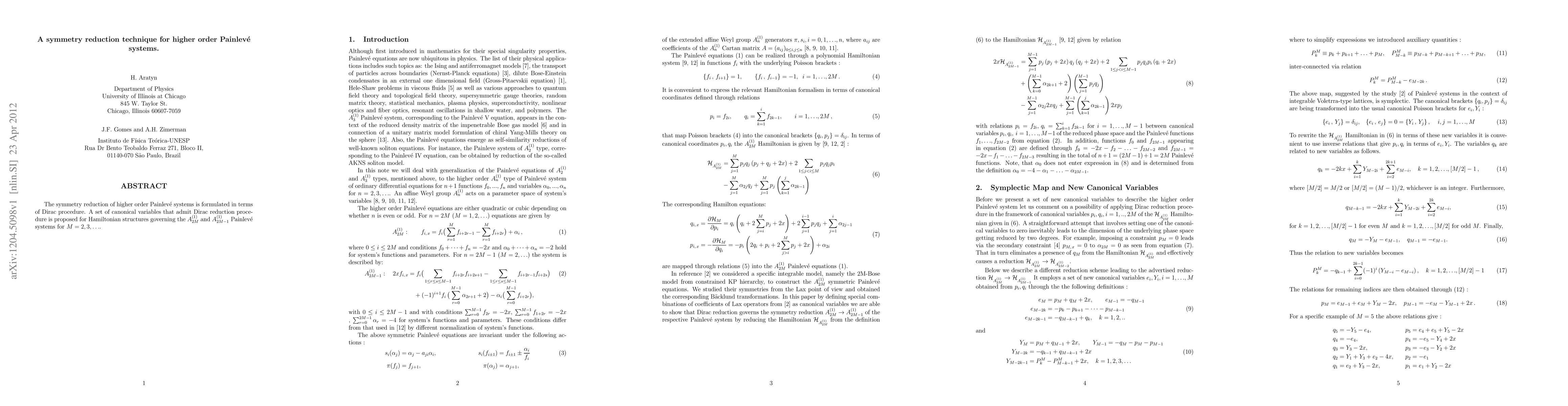 The symmetry reduction of higher order Painlev\'e systems is formulated in terms of Dirac procedure. A set of canonical variables that admit Dirac reduction procedure is proposed for Hamiltonian structures governing the ${A^{(1)}_{2M}}$ and ${A^{(1)}_{2M-1}}$ Painlev\'e systems for $M=2,3,...$.