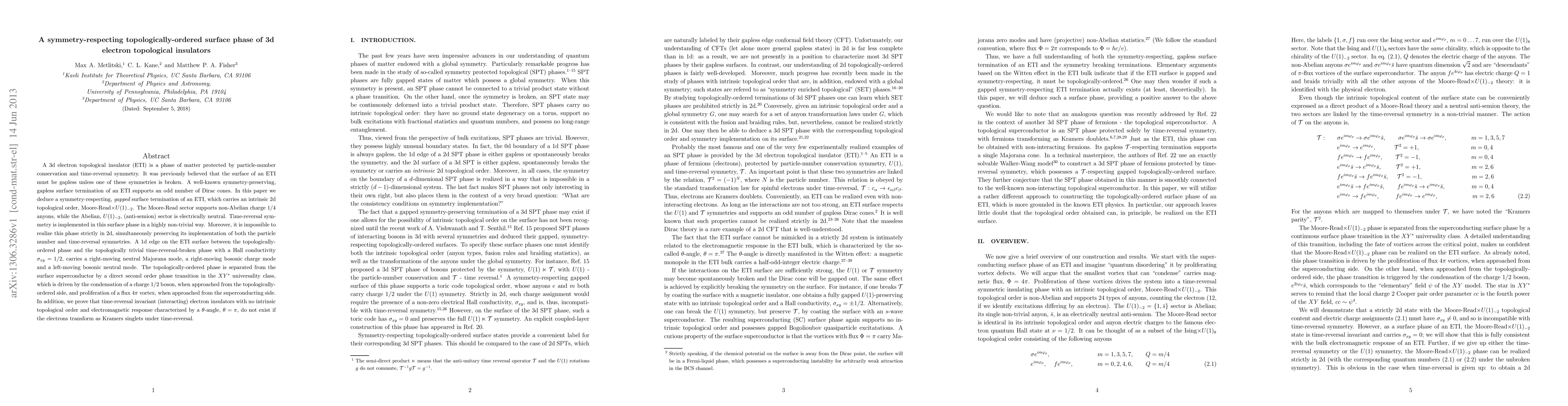 This paper reveals a symmetry-respecting, gapped surface phase of 3d electron topological insulators that exhibits intrinsic 2d topological order, specifically the Moore-Read x anti-semion state, featuring non-Abelian anyons and electrically neutral sectors. The phase transition to a surface superconductor is second-order, driven by specific bosonic condensations.